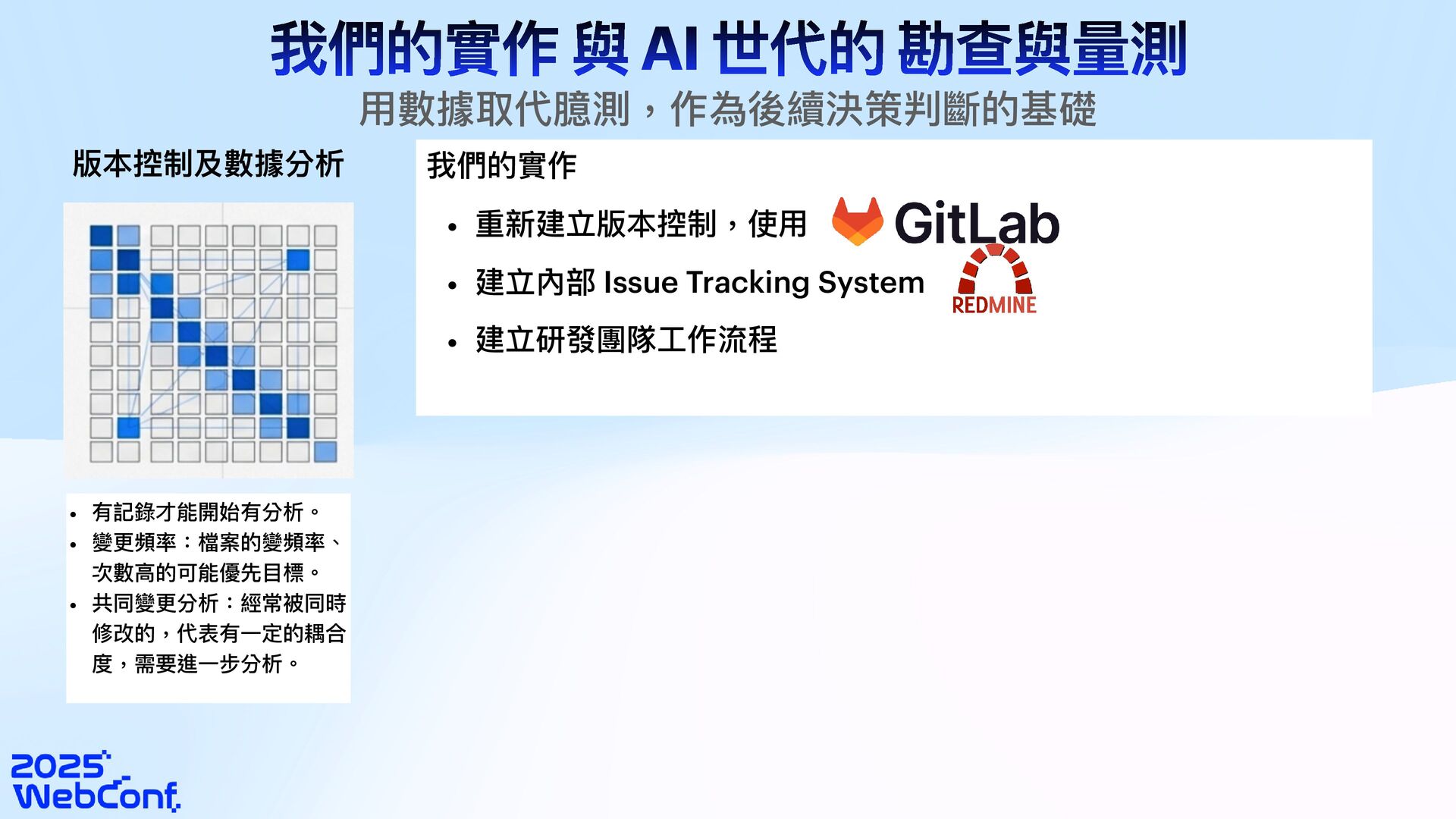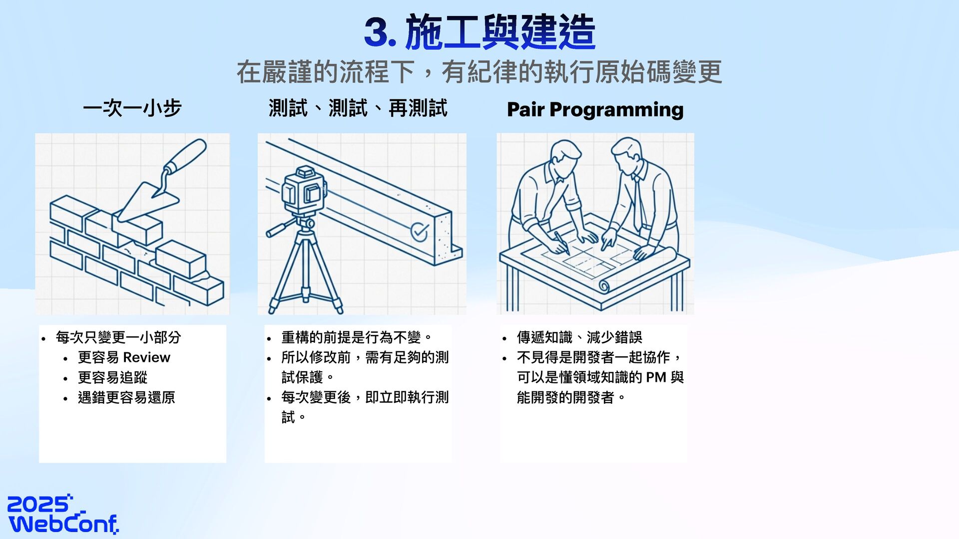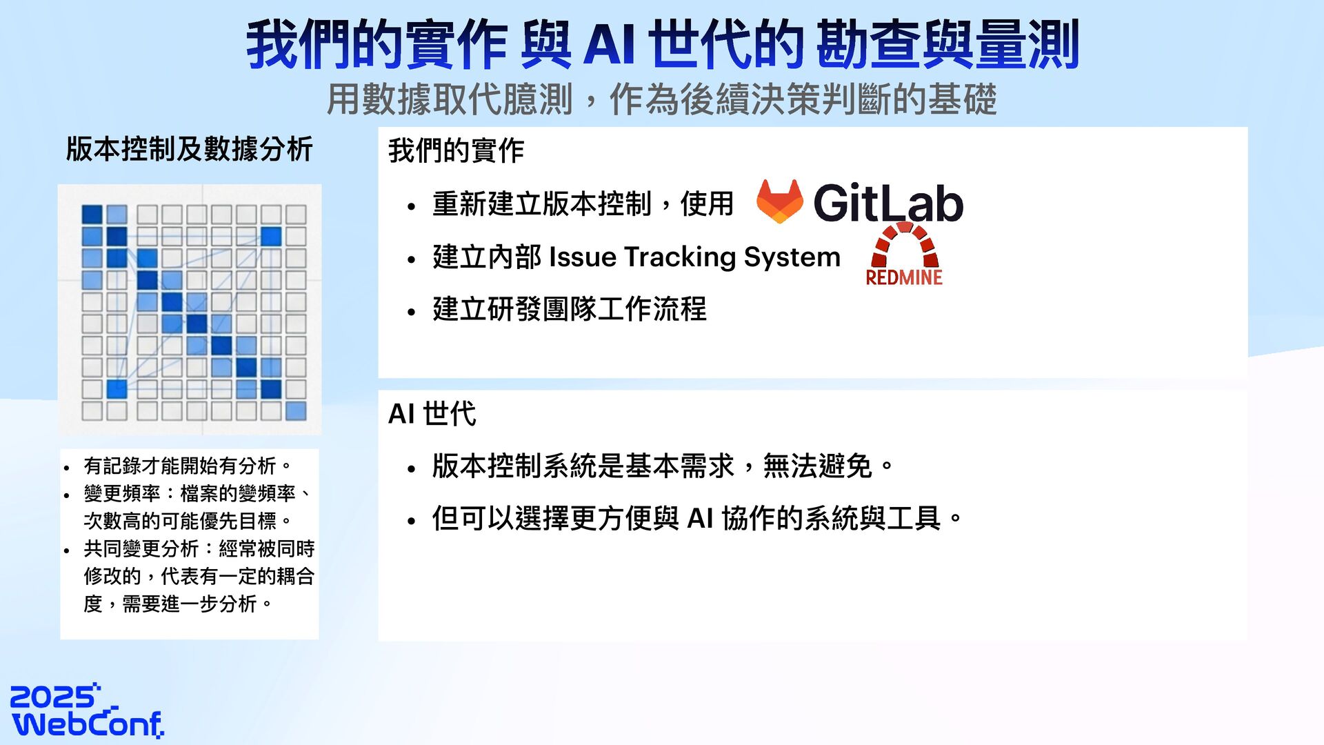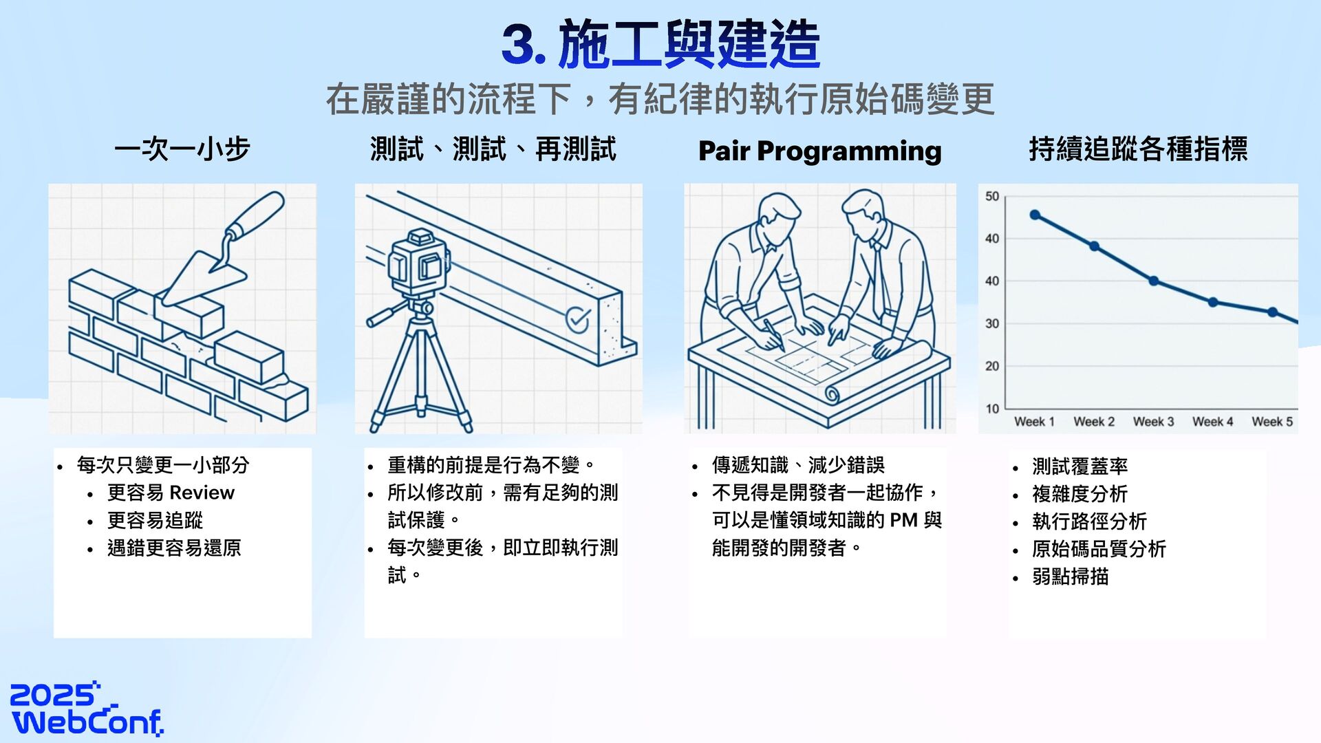 AI 介入後,如何在重構與維護過程中發揮助力,提升理解、驗證與調整的效率。