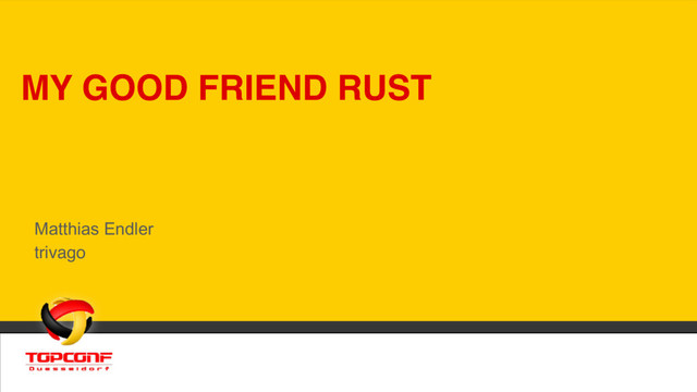 Let me show you what's in for you and why you should learn Rust, even though you might be a Web-Developer. The growing ecosystem of Rust libraries and the steadily improving IDE support will help a lot in getting started. I'll show you some practical code examples, tell you how trivago uses Rust and give an overview of the road ahead.