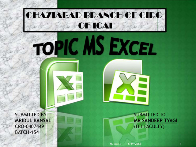 to create electronic spreadsheets. Within excel user can organize data ,create chart and perform calculations. Excel is a convenient program because it allow user to create large spreadsheets, reference information, and it allows for better storage of information. Excels operates like other Microsoft(MS) office programs and has many of the same functions and shortcuts of other MS programs. 1/19/2013 3 MS EXCEL