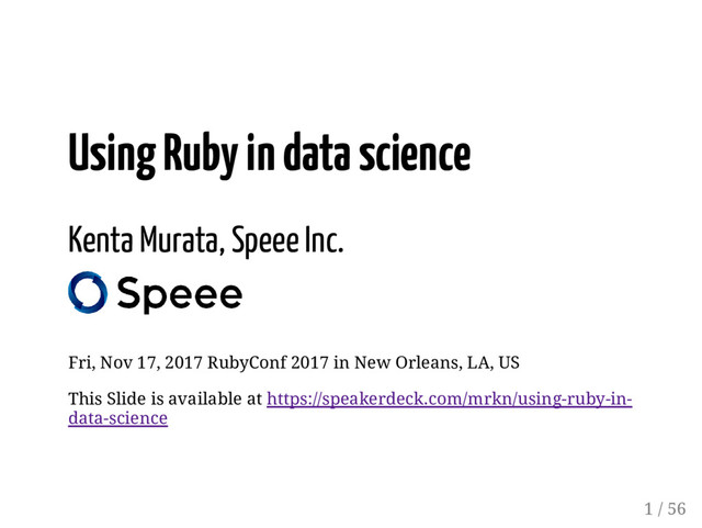 CRuby committer. I'm permitted by my company to do any great things for Ruby ecosystem. In this year, I'm totally working for making tools for data science that are used with ap- plications written in Ruby 13 / 56