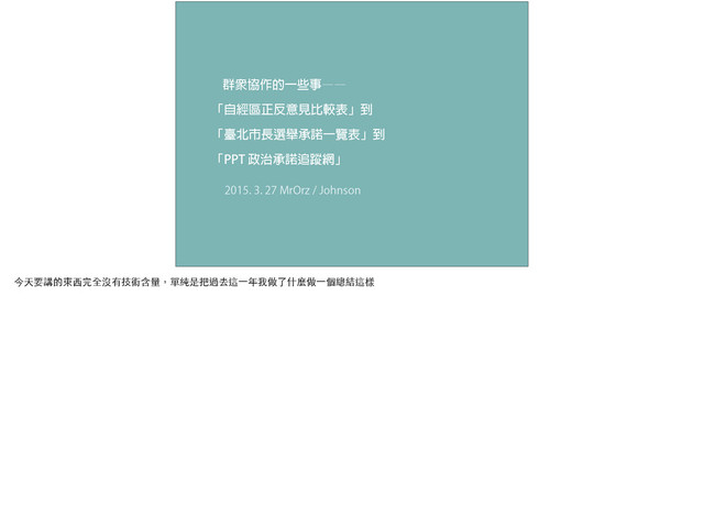 protection in his everyday life. The answer, he said, is to try to find disagreement that doesn’t threaten you and your social group — and one way to do that is to consciously seek it out in your group. It’s good advice, but it requires, as a prerequisite, a desire to expose yourself to uncomfortable evidence — and a confidence that the knowledge won’t hurt you. Vox 記者訪談 (Cites http://www.vox.com/2014/4/6/5556462/brain-dead-how-politics-makes-us-stupid)(http://goo.gl/OKJOfu) ! 群眾協作、⼤大眾的書寫,或許不要只去看與⾃自⾝身⽴立場⼀一致的⼈人,可以多多去找舒適圈內、不會威脅到你,卻⼜又不同意你的那些⼈人。 ! 你要願意把⾃自⼰己暴露在不願⾯面對的真相。