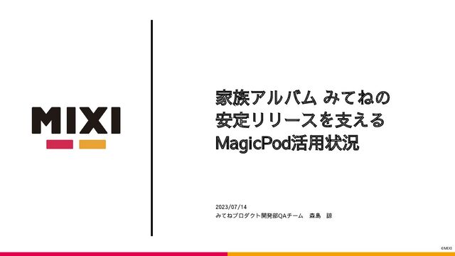 ©MIXI 家族アルバム みてねの 安定リリースを支える MagicPod活用状況 2023/07/14 みてねプロダクト開発部QAチーム 森島 諒