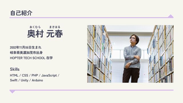 奥村 元春 自己紹介 おくむら まさはる 2002年11月06日生まれ 岐阜県美濃加茂市出身 HOPTER TECH SCHOOL 在学
