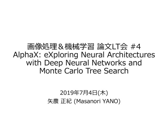and Monte Carlo Tree Search 論文のURL: https://arxiv.org/abs/1903.01747 旧バージョン?: https://arxiv.org/abs/1805.07440 ⇒ NASに「AlphaZero方式のMCTS」を適用した論文 著者は、アメリカ東海岸のブラウン大学とFAIRメンバー (Third Authorは、東大出身の陣内佑さん) 選んだ理由 ・MCTSの応用に関心があり、arXiv論文を検索 ・NASは全くの素人(汎用性に疑問、でも少しは知りたい) NAS: Neural Architecture Search(ニューラルアーキテクチャ探索) MCTS: Monte-Carlo Tree Search(モンテカルロ木探索)