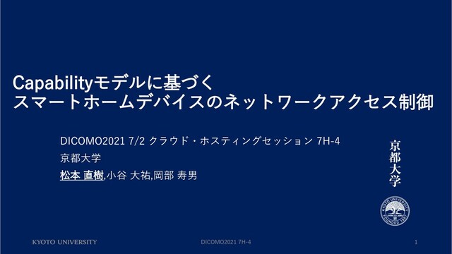 Capabilityモデルに基づく スマートホームデバイスのネットワークアクセス制御 DICOMO2021 7/2 クラウド・ホスティングセッション 7H-4 京都大学 松本 直樹,小谷 大祐,岡部
