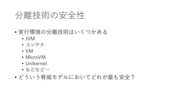 such as the use of SGX or EPT is fundamentally stronger than software-enforced isolation (containers/software LibOS) [A Binary-Compatible Unikernel(VEE ’19)] • 言語の仕様レベルで制限をかける JVM も割と安全? • IoT 分野ではほどほどの安全性で高速な コンテナ が使われることが多い • JVM with VM という選択肢もある • 攻撃された後の被害を最小化する → ネットワークのアクセス可能範囲の制限