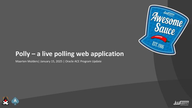 During this short presentation at the January 2025 Oracle ACE Program Update, I discussed one of my pet projects, Polly - a live polling web application. Topics included the goals of this project, the technologies in use (with a strong role for Java and the Oracle Cloud), some of the challenges I had to face and ideas for future development. Of course, I couldn't help myself but also run a live demo.