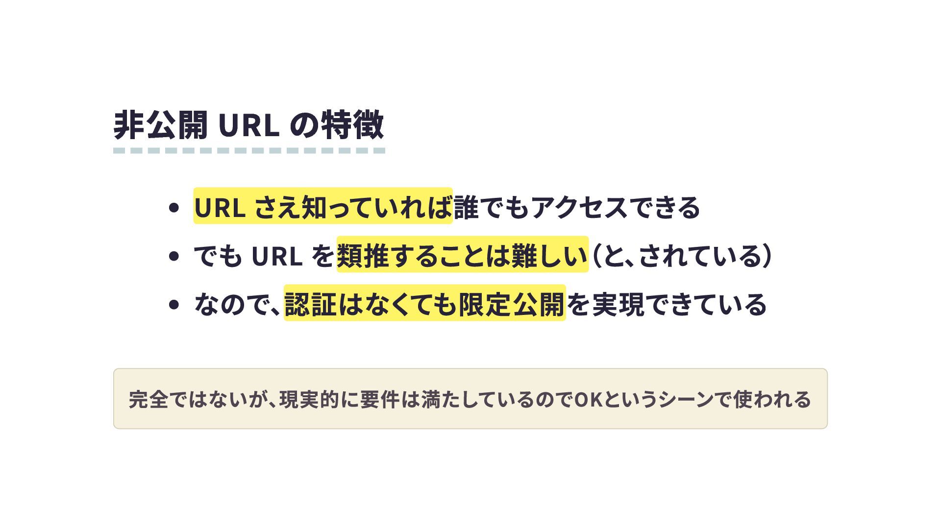 非公開 URL の特徴 - *URL さえ知っていれば*誰でもアクセスできる - でも URL を*類推することは難しい*(と、されている) - なので、*認証はなくても限定公開*を実現できている