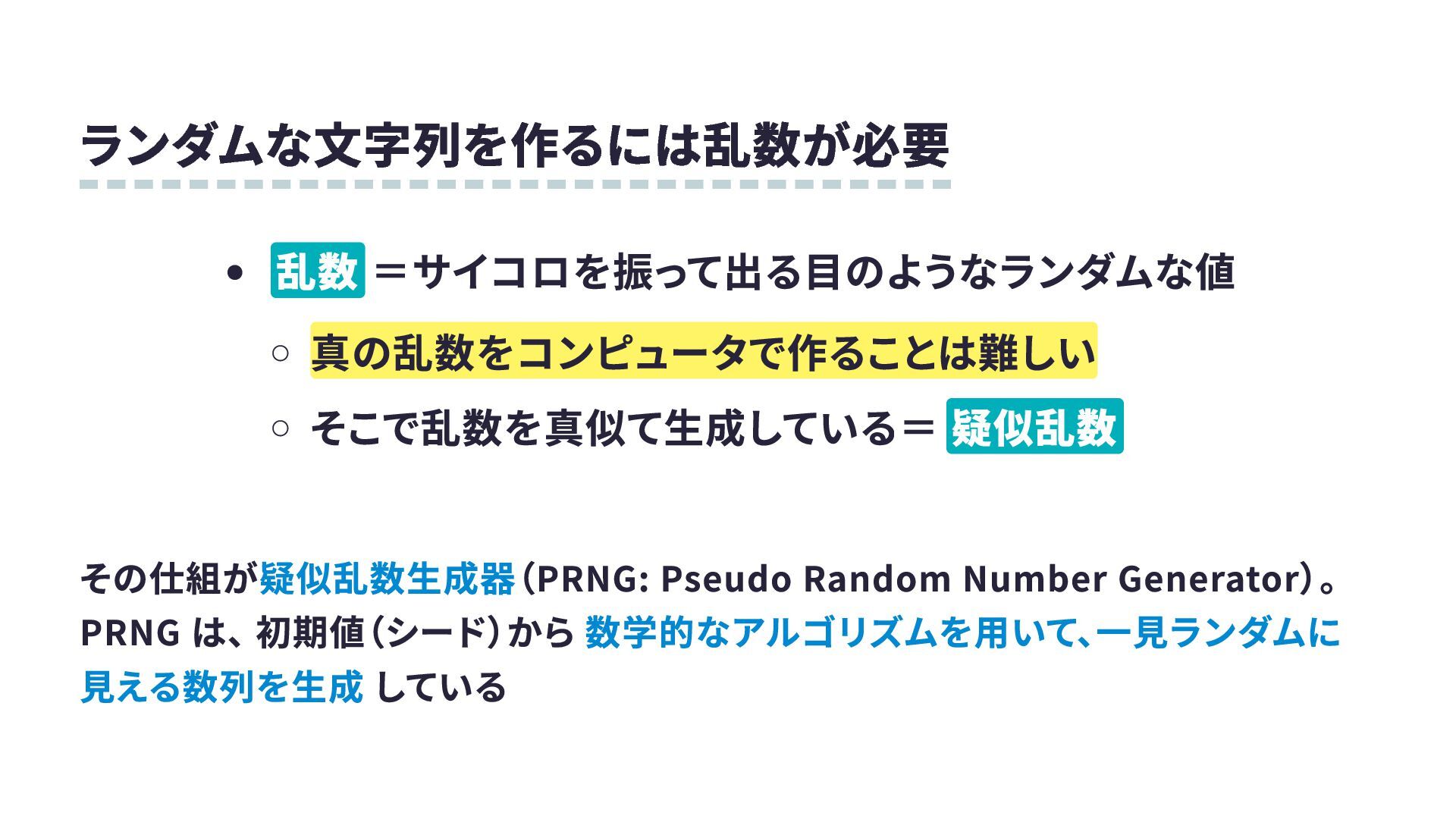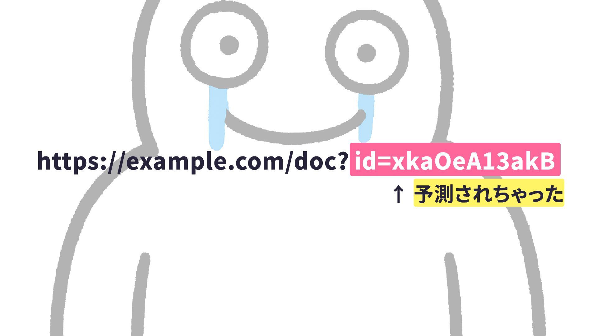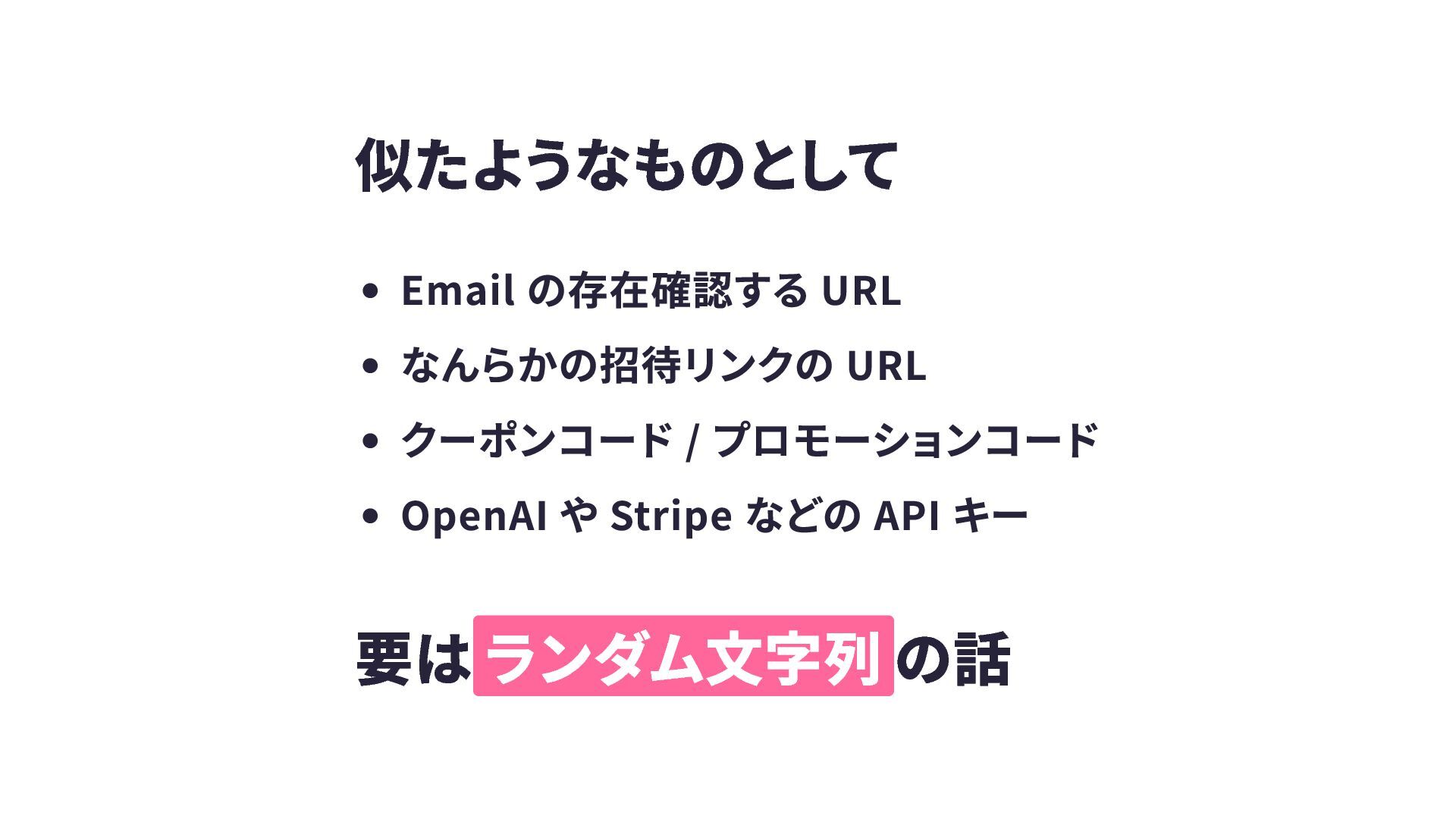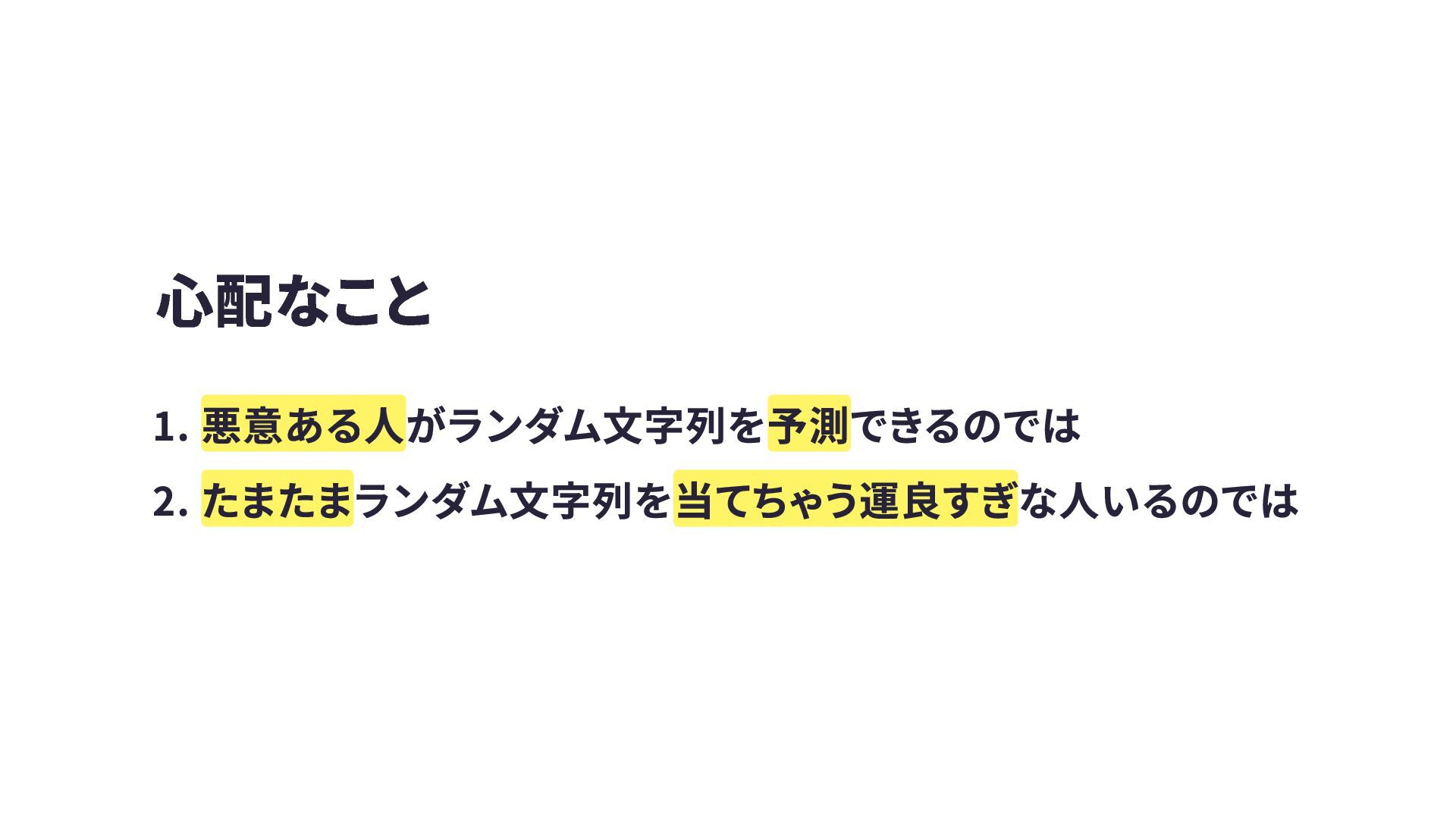 心配なこと 1. *悪意ある人*がランダム文字列を*予測*できるのでは 2. *たまたま*ランダム文字列を*当てちゃう運良すぎ*な人いるのでは