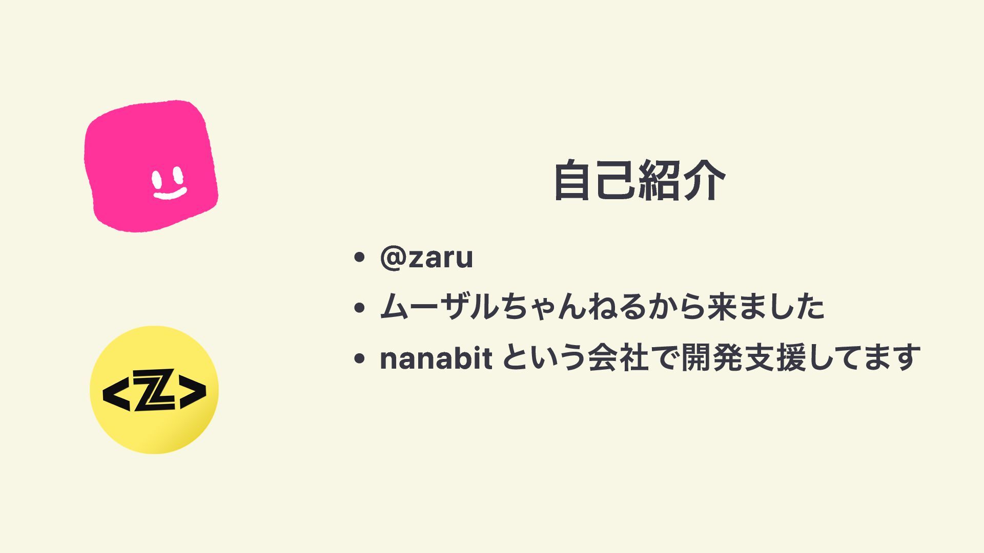 自己紹介 @zaru ムーザルちゃんねるから来ました nanabit という会社で開発支援してます