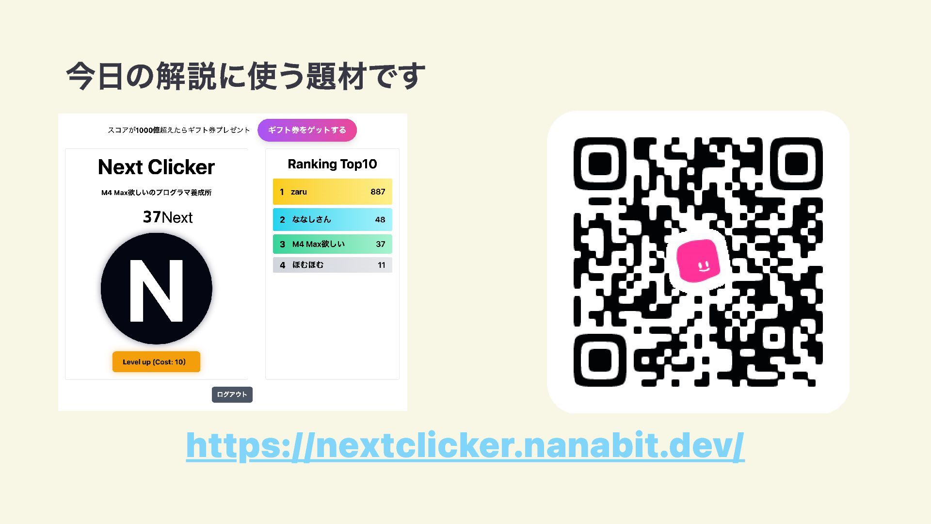 https://nextclicker.nanabit.dev/ 今日の解説に使う題材です