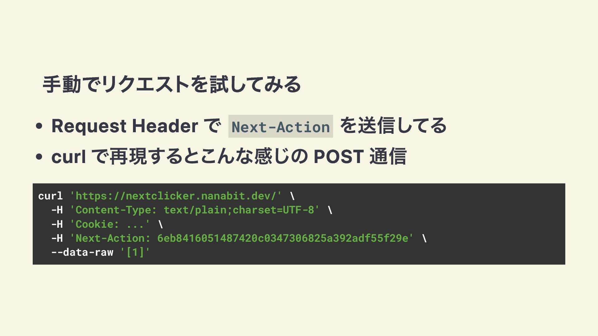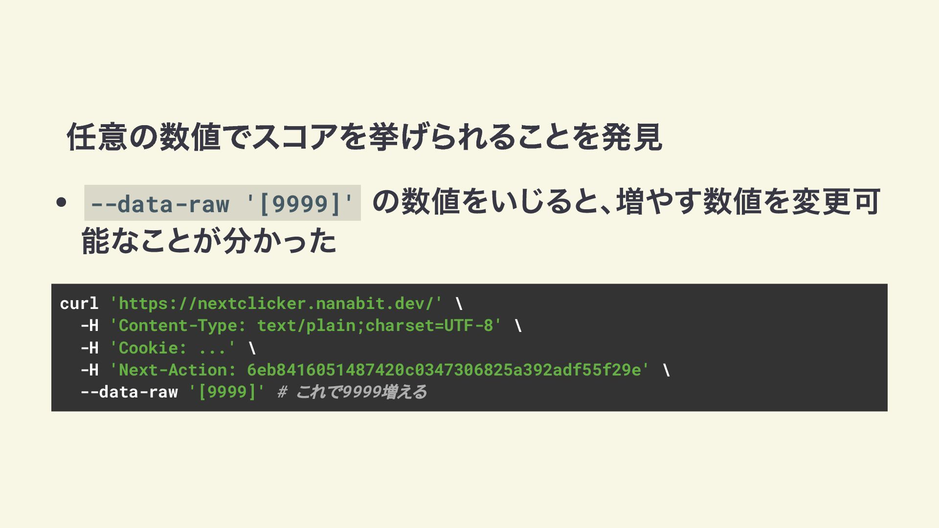 --data-raw '[9999]' の数値をいじると、 増やす数値を変更可 能なことが分かった curl 'https://nextclicker.nanabit.dev/' \ -H 'Content-Type: