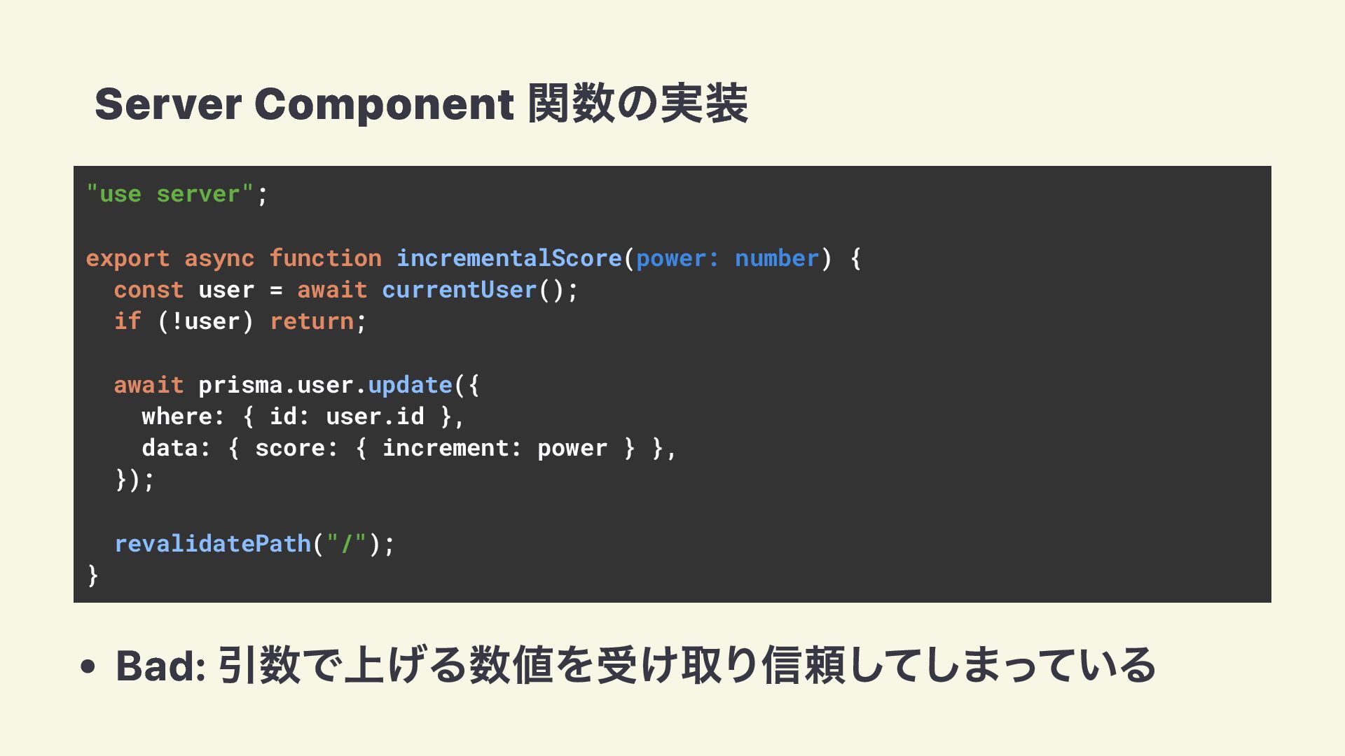 = await currentUser(); if (!user) return; await prisma.user.update({ where: { id: user.id }, data: { score: { increment: power } }, }); revalidatePath("/"); } Bad: 引数で上げる数値を受け取り信頼してしまっている Server Component 関数の実装