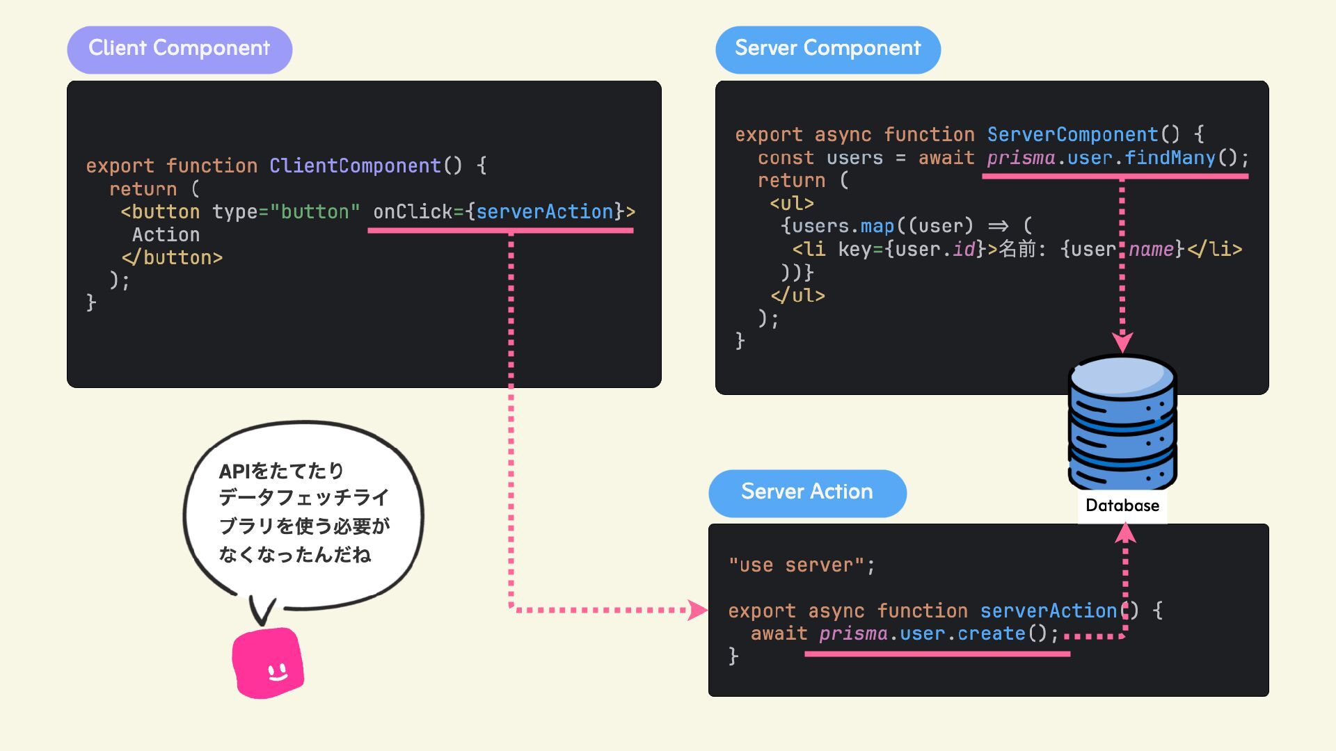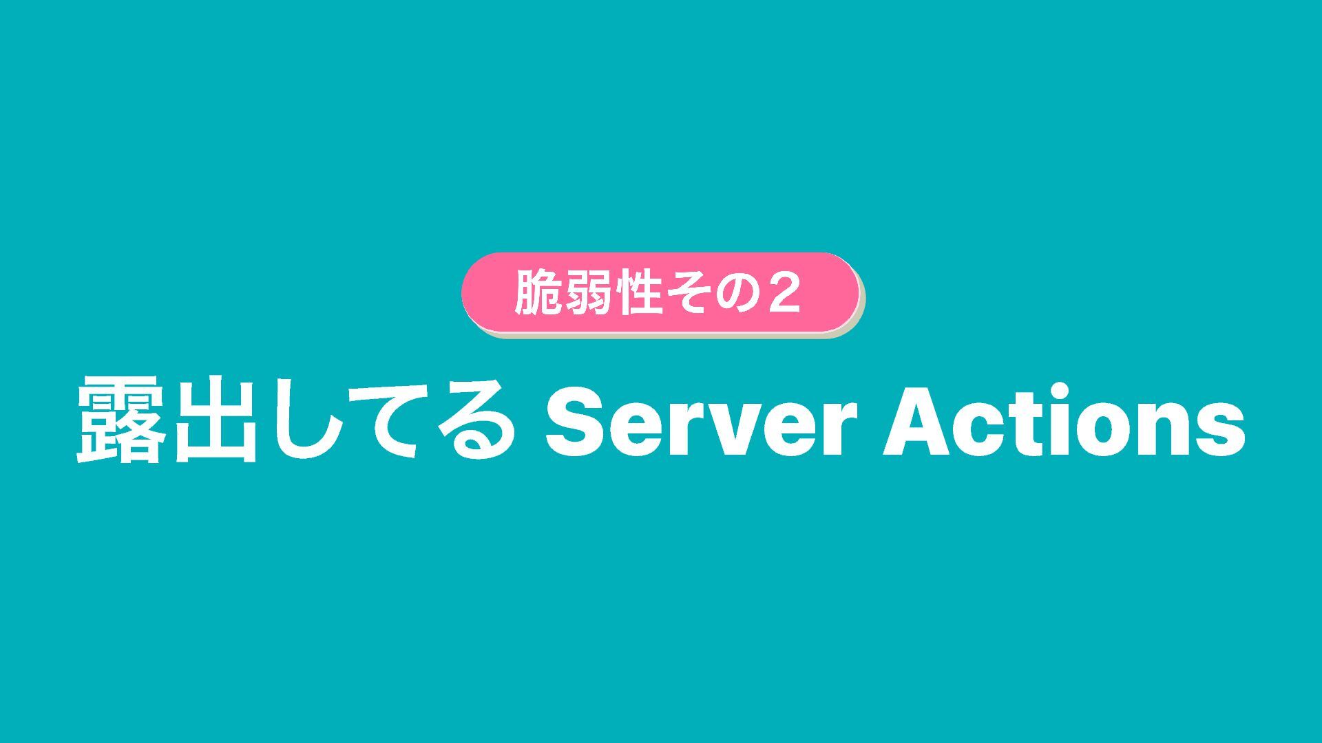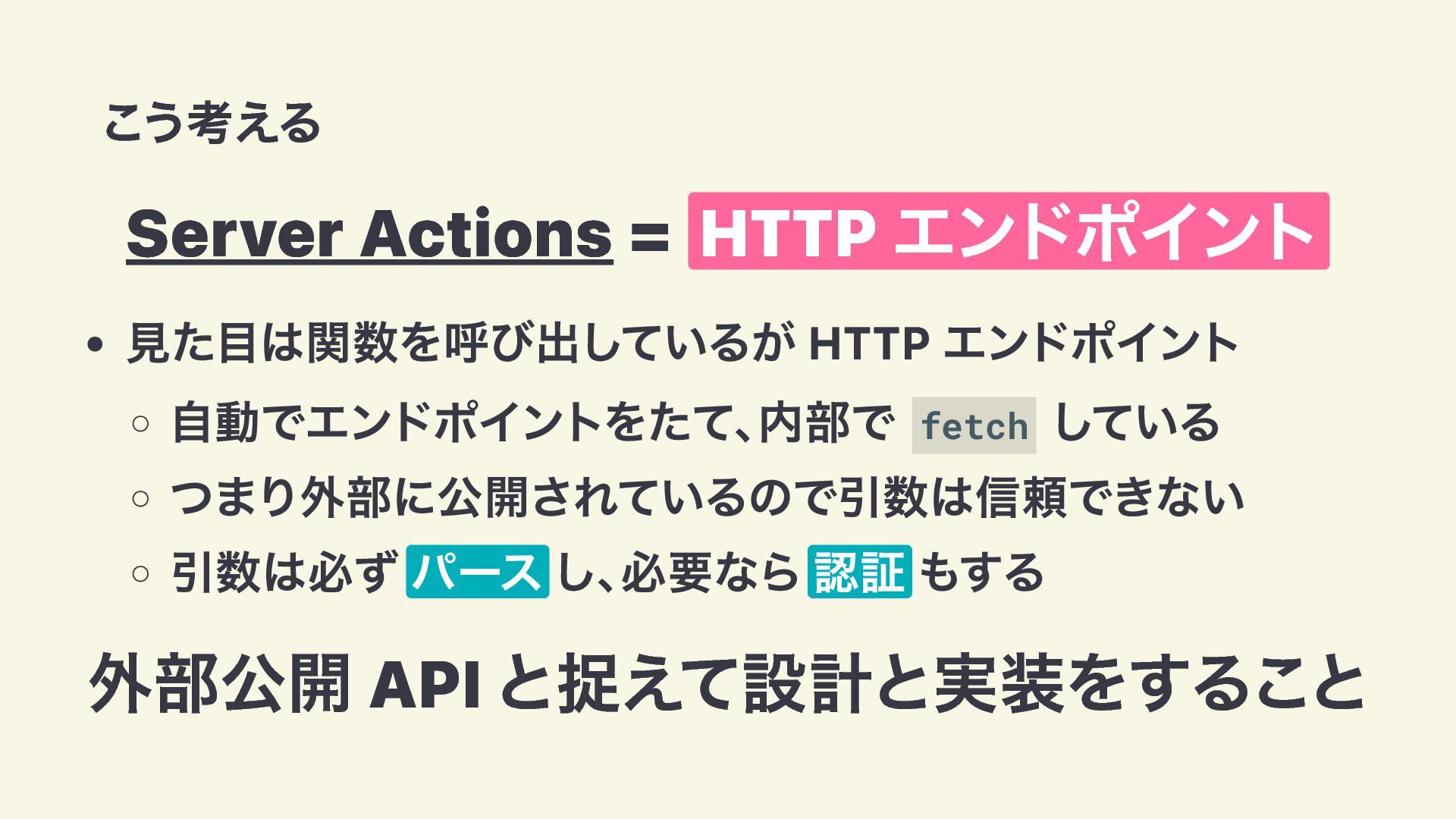 Server Actions = HTTP エンドポイント 見た目は関数を呼び出しているが HTTP エンドポイント 自動でエンドポイントをたて、 内部で