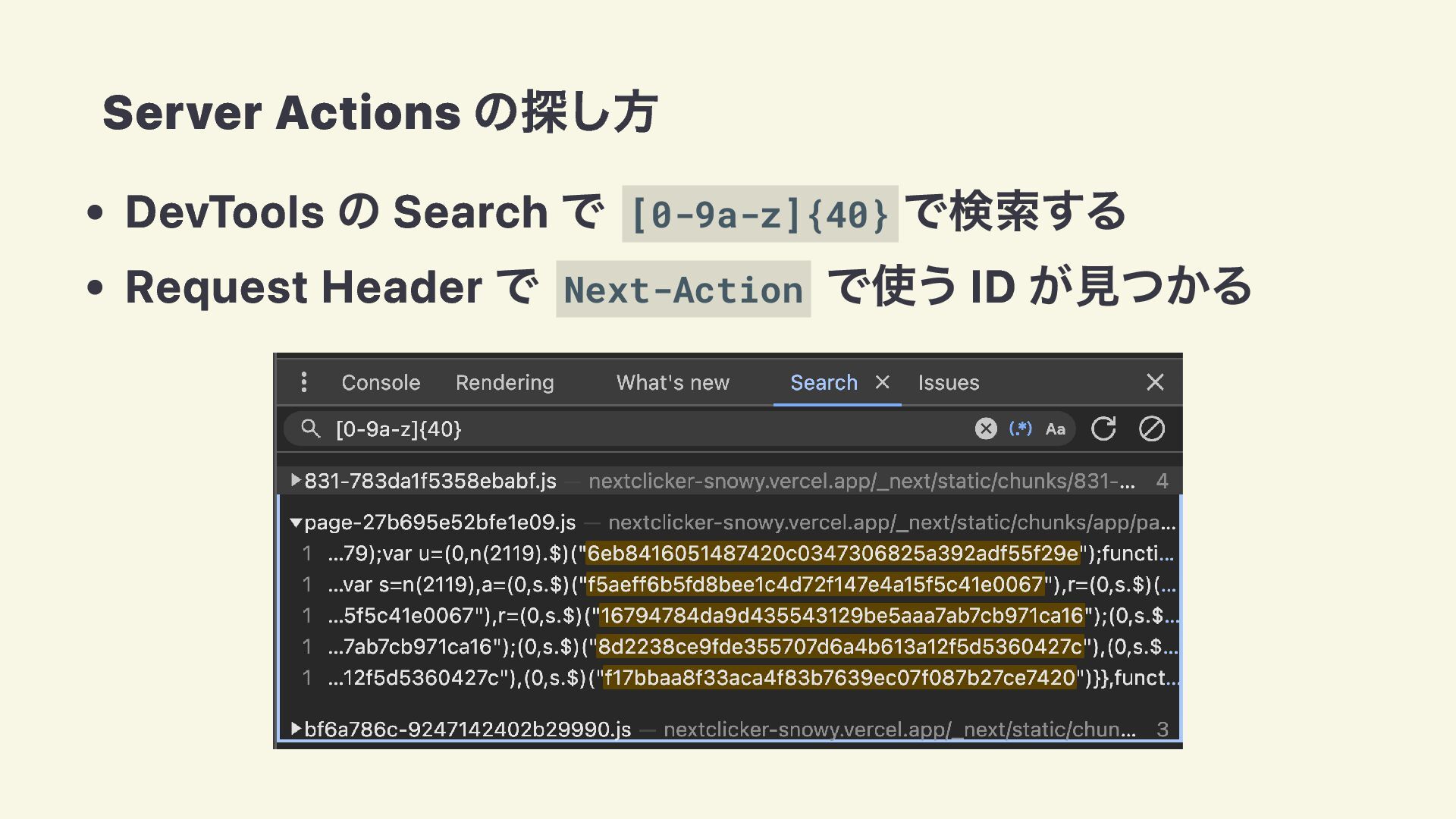 DevTools の Search で [0-9a-z]{40} で検索する Request Header で Next-Action