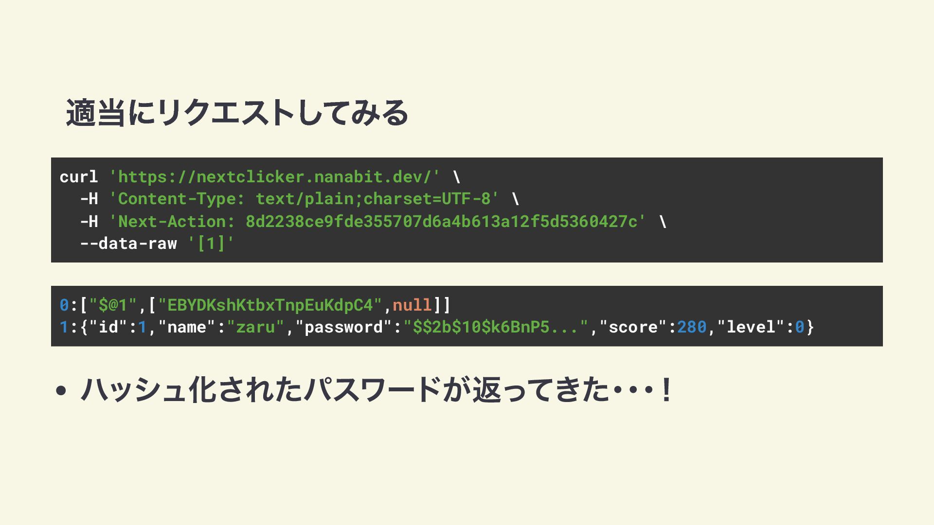 \ --data-raw '[1]' 0:["$@1",["EBYDKshKtbxTnpEuKdpC4",null]] 1:{"id":1,"name":"zaru","password":"$$2b$10$k6BnP5...","score":280,"level":0} ハッシュ化されたパスワードが返ってきた・ ・ ・! 適当にリクエストしてみる