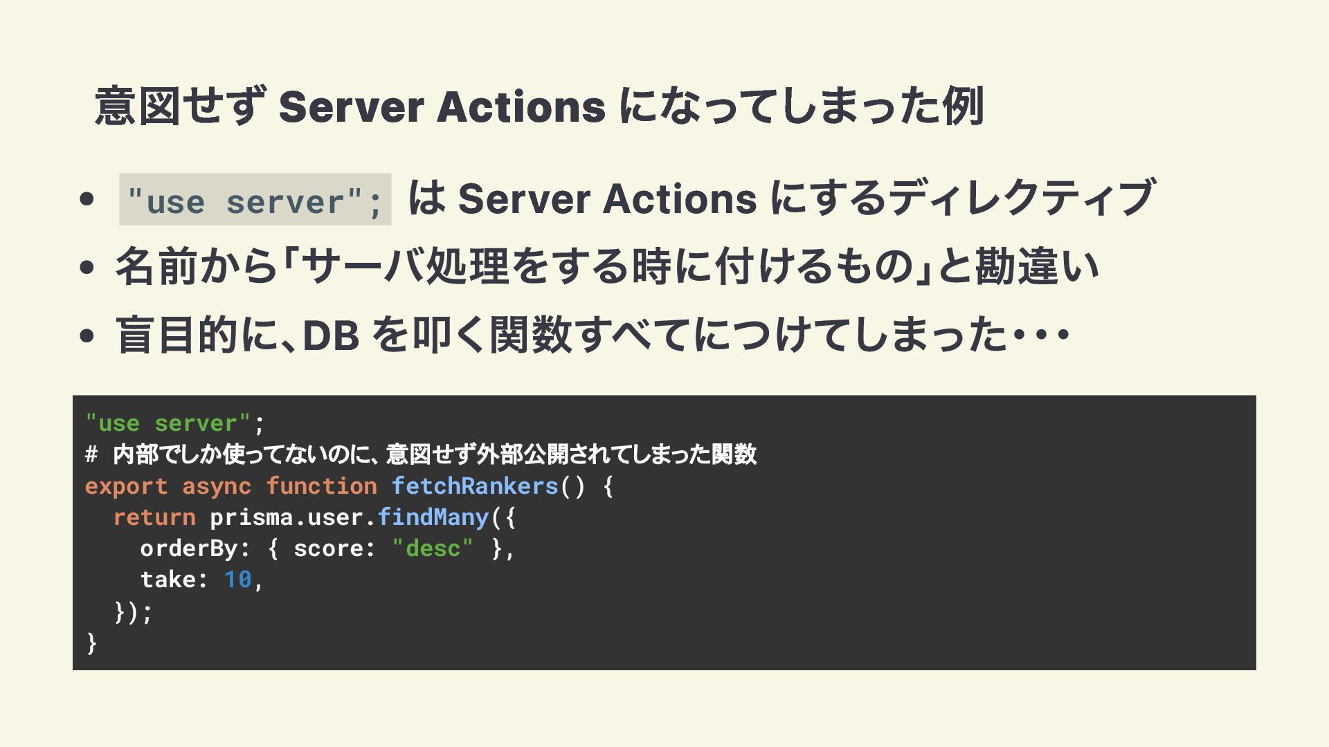 DB を叩く関数すべてにつけてしまった・ ・ ・ "use server"; # 内部でしか使ってないのに、意図せず外部公開されてしまった関数 export async function fetchRankers() { return prisma.user.findMany({ orderBy: { score: "desc" }, take: 10, }); } 意図せず Server Actions になってしまった例