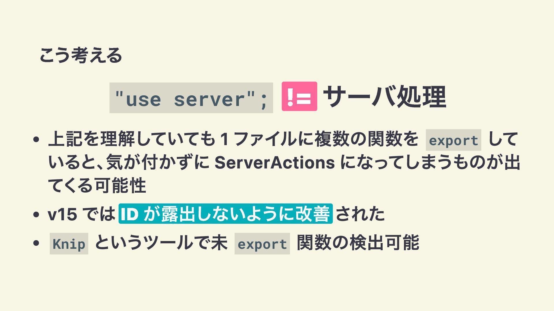 気が付かずに ServerActions になってしまうものが出 てくる可能性 v15 ではID が露出しないように改善された Knip というツールで未 export 関数の検出可能 こう考える