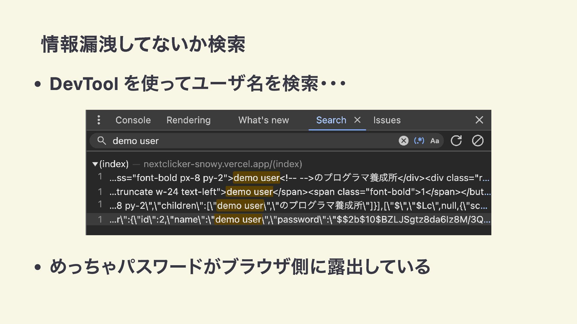 DevTool を使ってユーザ名を検索・ ・ ・ めっちゃパスワードがブラウザ側に露出している 情報漏洩してないか検索