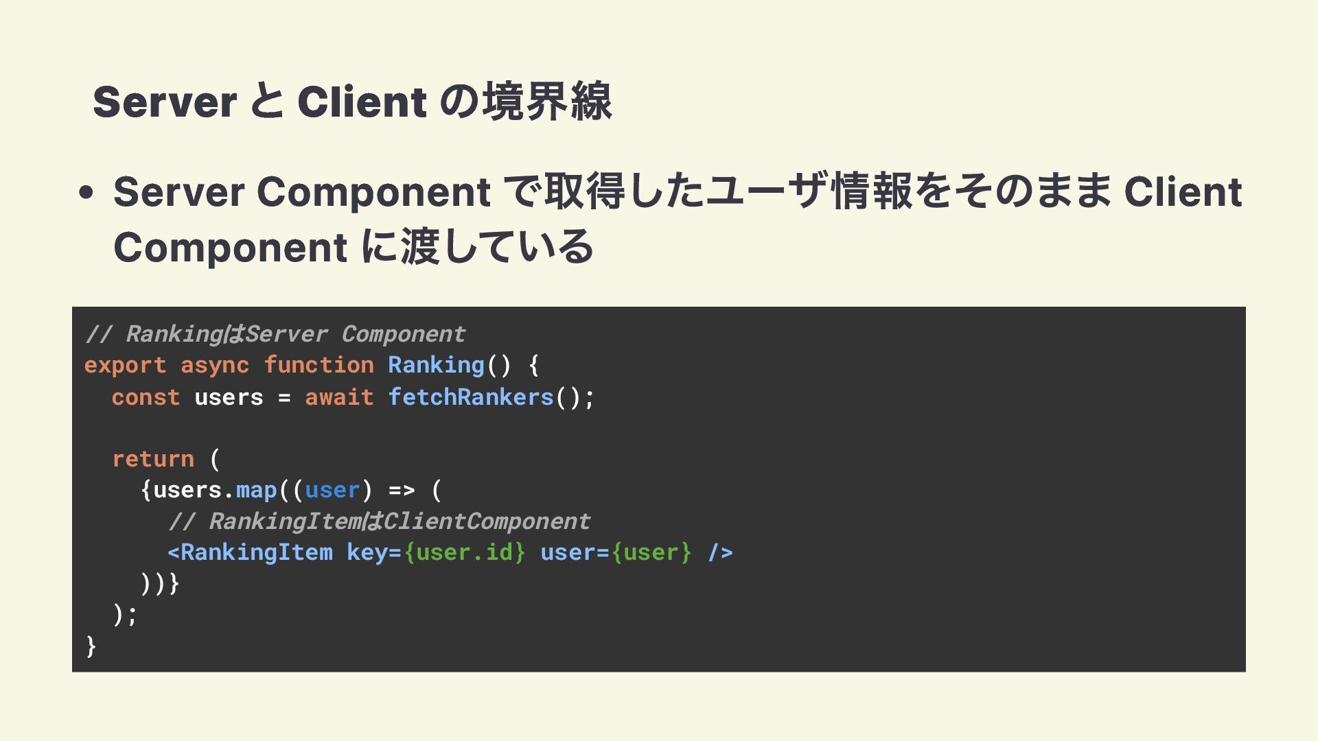 async function Ranking() { const users = await fetchRankers(); return ( {users.map((user) => ( // RankingItemはClientComponent <RankingItem key={user.id} user={user} /> ))} ); } Server と Client の境界線