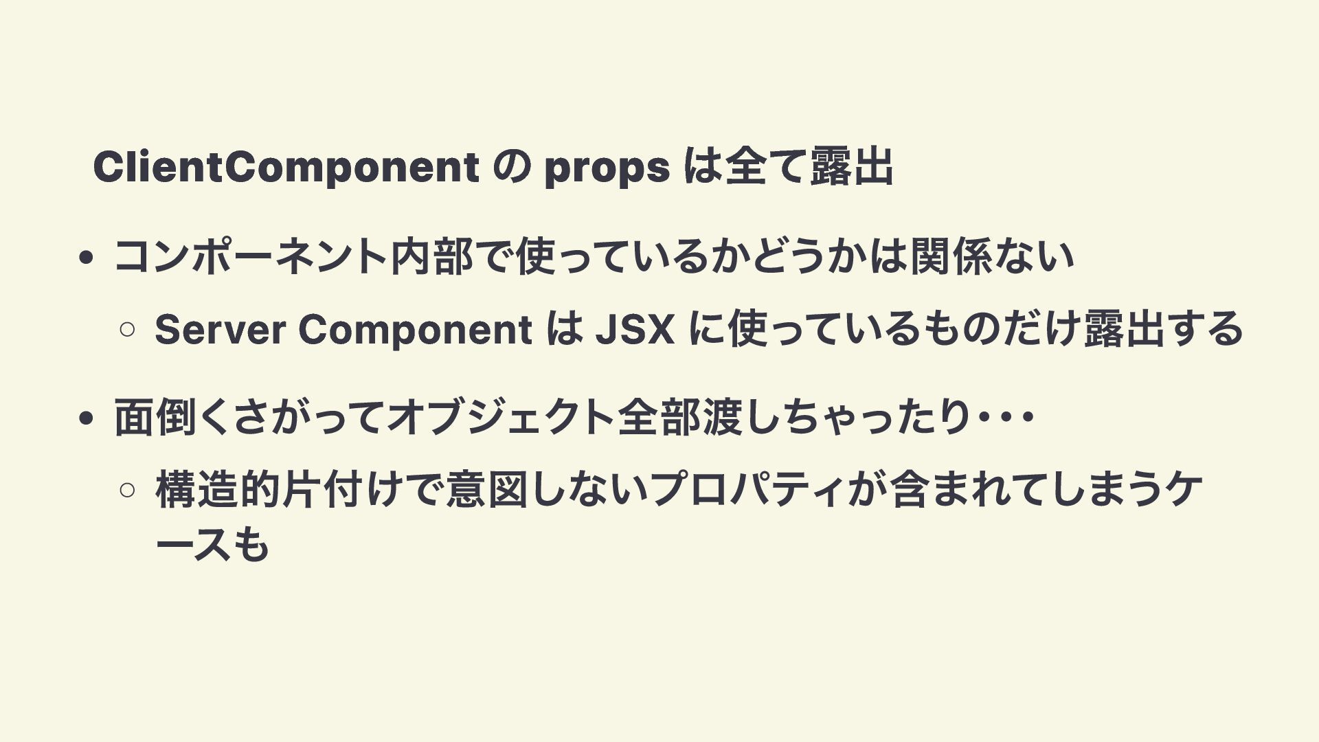 コンポーネント内部で使っているかどうかは関係ない Server Component は JSX に使っているものだけ露出する 面倒くさがってオブジェクト全部渡しちゃったり・ ・ ・ 構造的片付けで意図しないプロパティが含まれてしまうケ