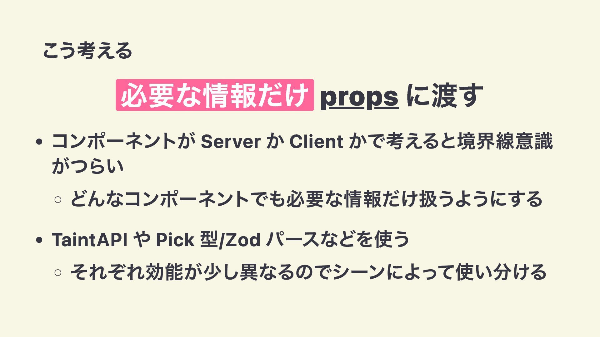 必要な情報だけ props に渡す コンポーネントが Server か Client かで考えると境界線意識 がつらい どんなコンポーネントでも必要な情報だけ扱うようにする