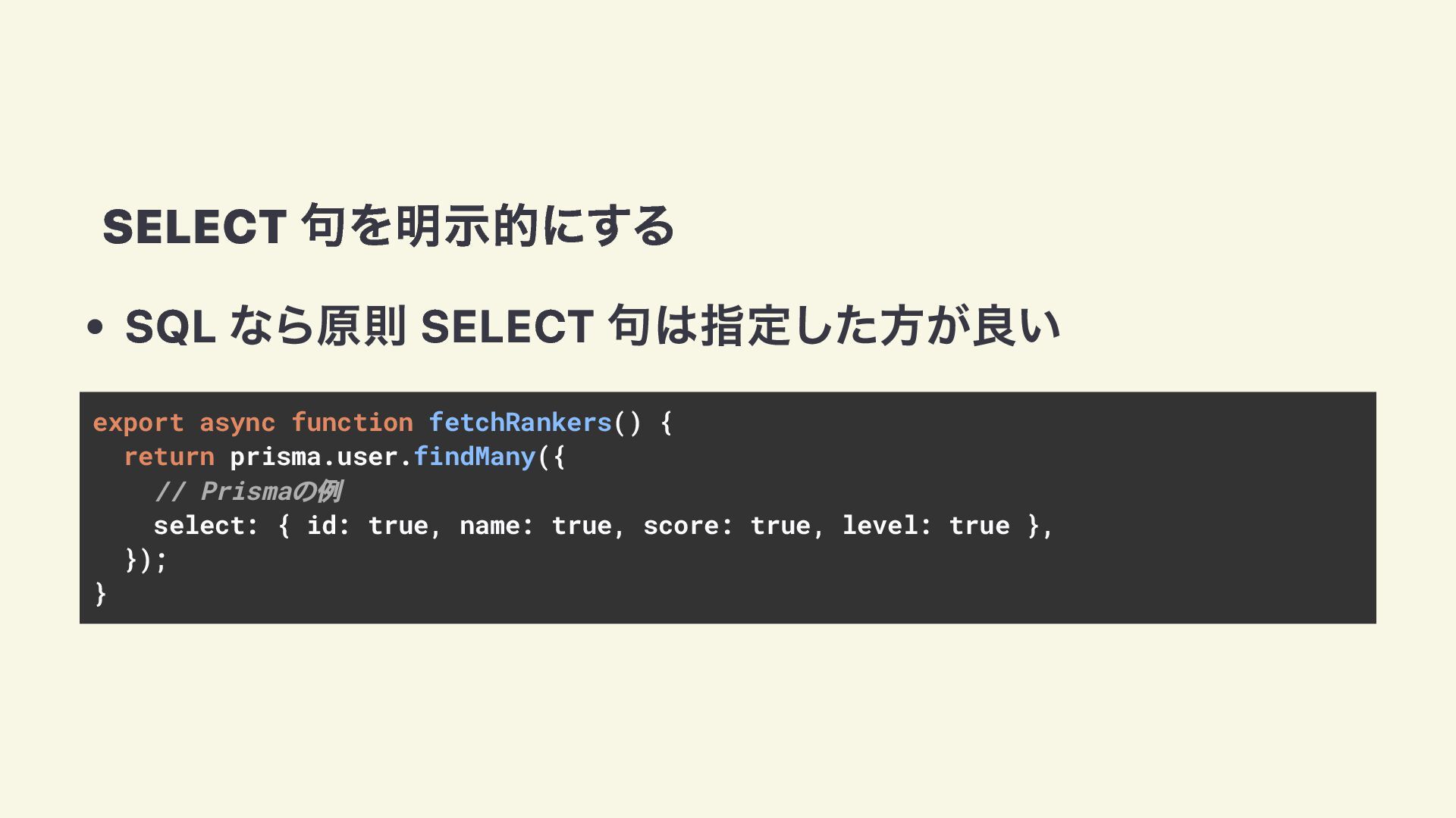 prisma.user.findMany({ // Prismaの例 select: { id: true, name: true, score: true, level: true }, }); } SELECT 句を明示的にする