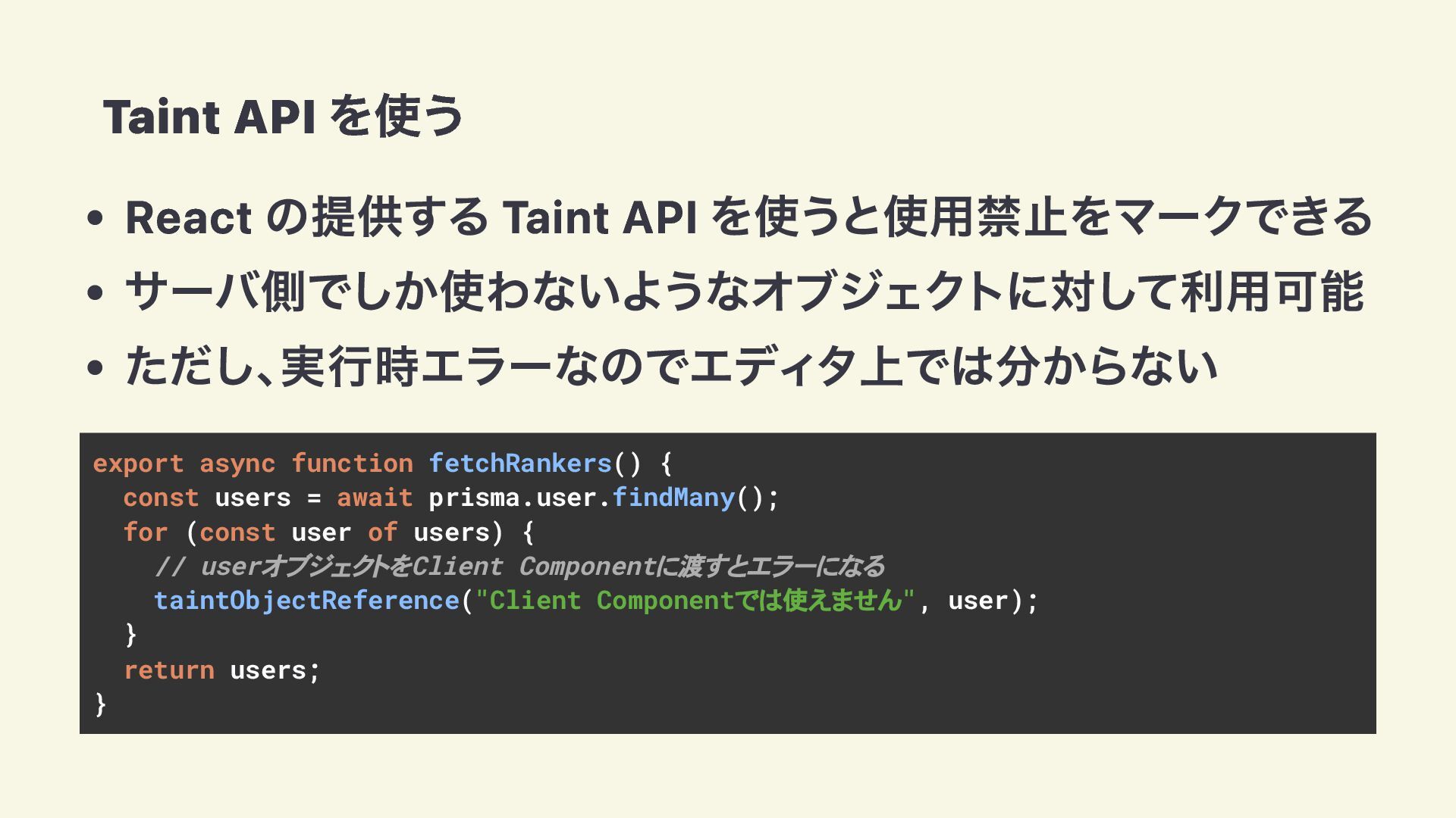 function fetchRankers() { const users = await prisma.user.findMany(); for (const user of users) { // userオブジェクトをClient Componentに渡すとエラーになる taintObjectReference("Client Componentでは使えません", user); } return users; } Taint API を使う
