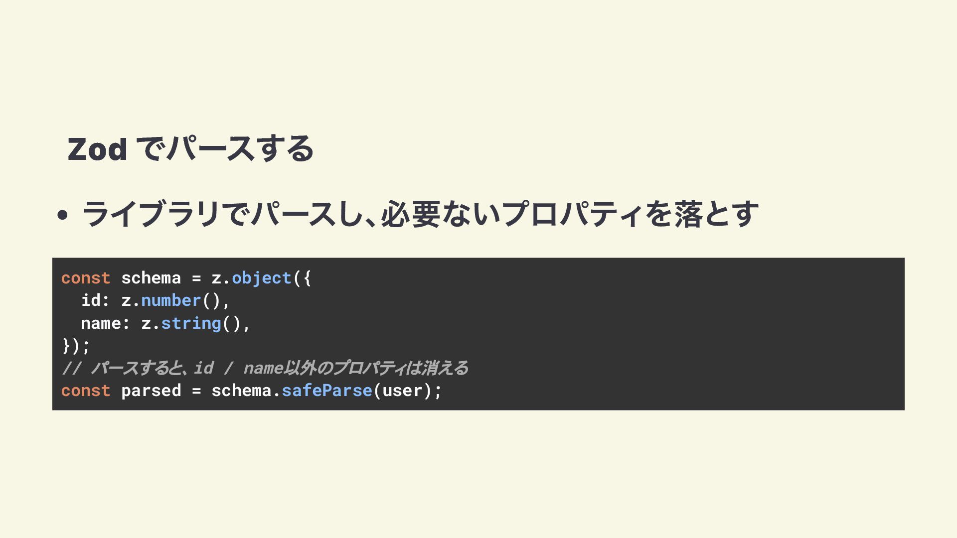 ライブラリでパースし、 必要ないプロパティを落とす const schema = z.object({ id: z.number(), name: z.string(),