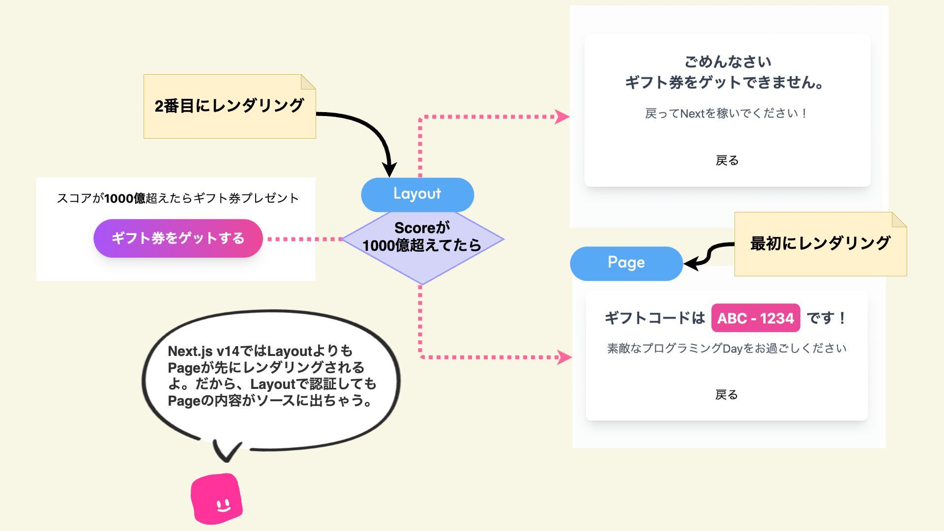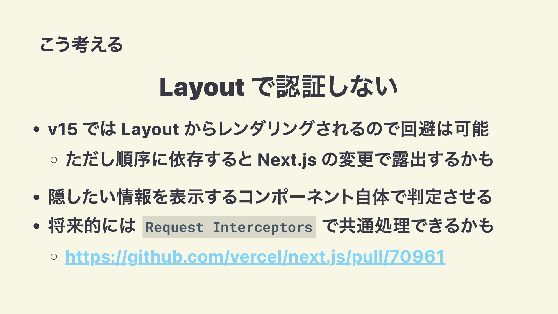 Layout で認証しない v15 では Layout からレンダリングされるので回避は可能 ただし順序に依存すると Next.js の変更で露出するかも 隠したい情報を表示するコンポーネント自体で判定させる