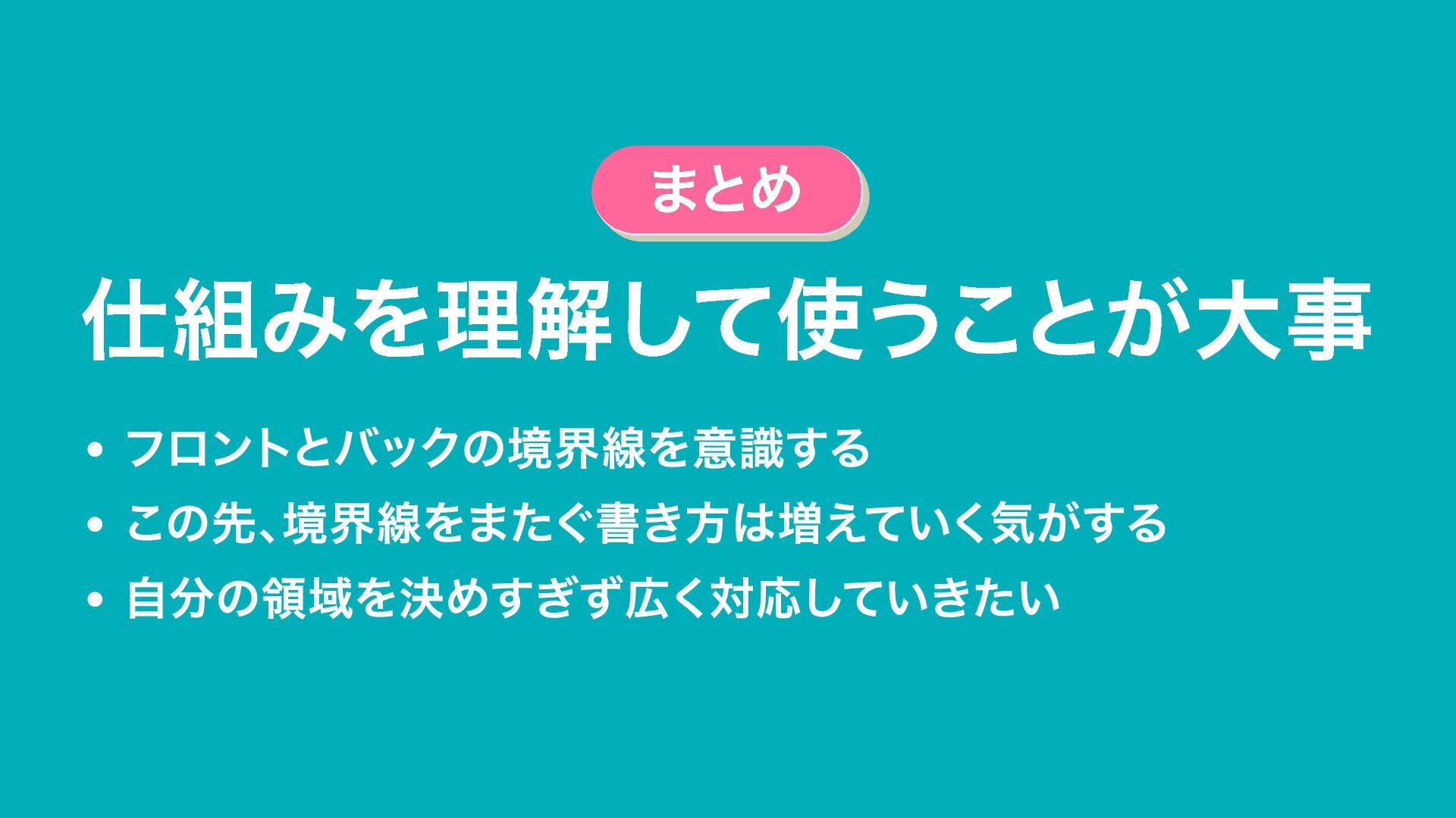仕組みを理解して使うことが大事 フロントとバックの境界線を意識する この先、 境界線をまたぐ書き方は増えていく気がする 自分の領域を決めすぎず広く対応していきたい