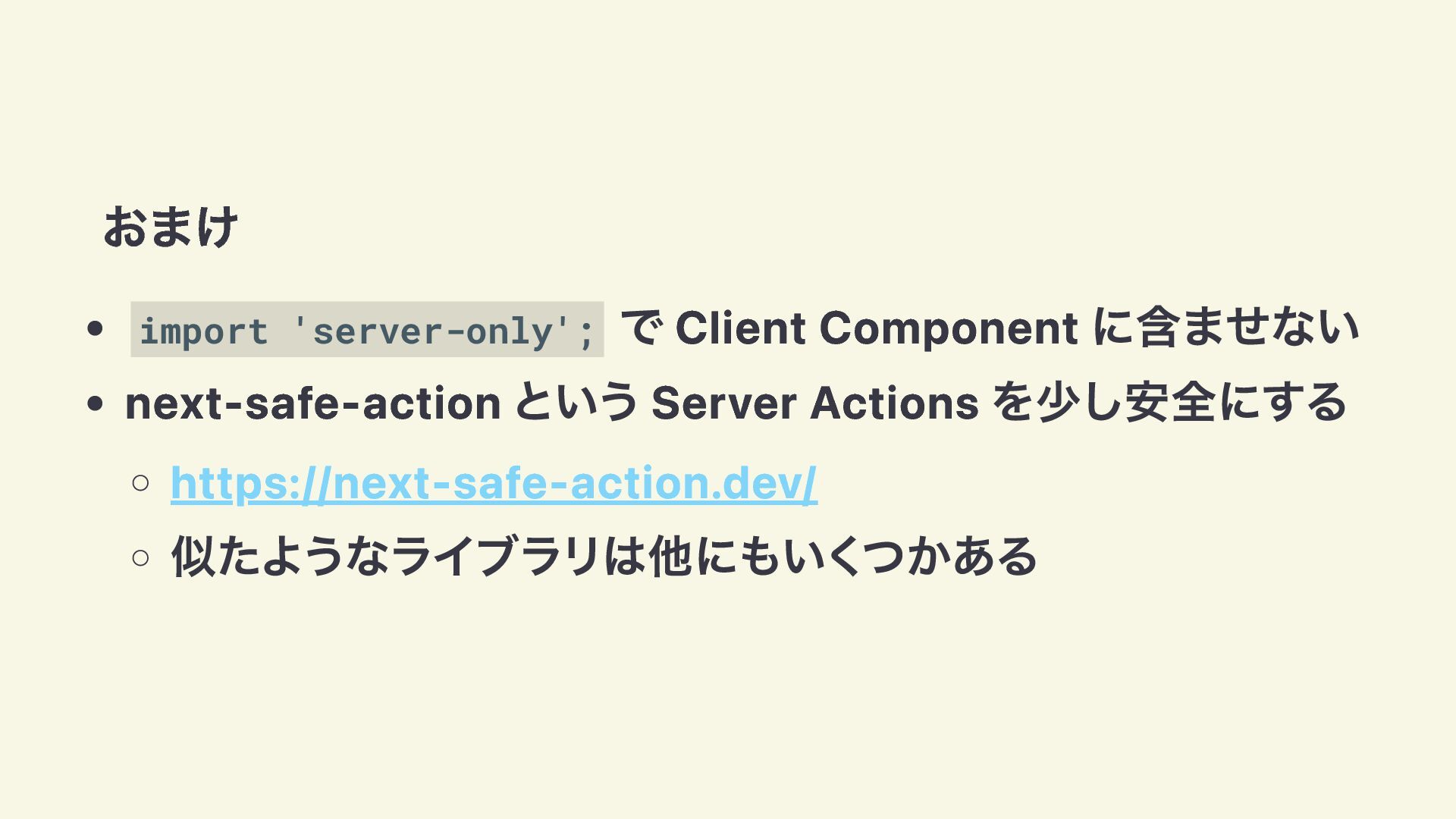 を少し安全にする https://next-safe-action.dev/ 似たようなライブラリは他にもいくつかある おまけ