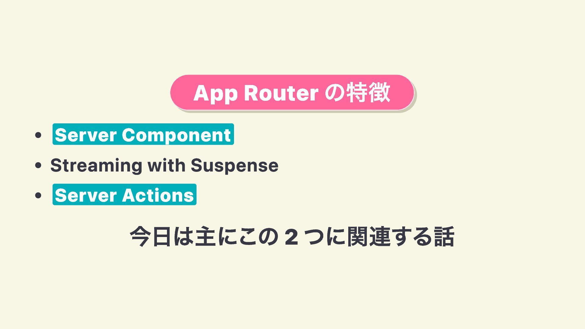 Server Component Streaming with Suspense Server Actions 今日は主にこの 2 つに関連する話