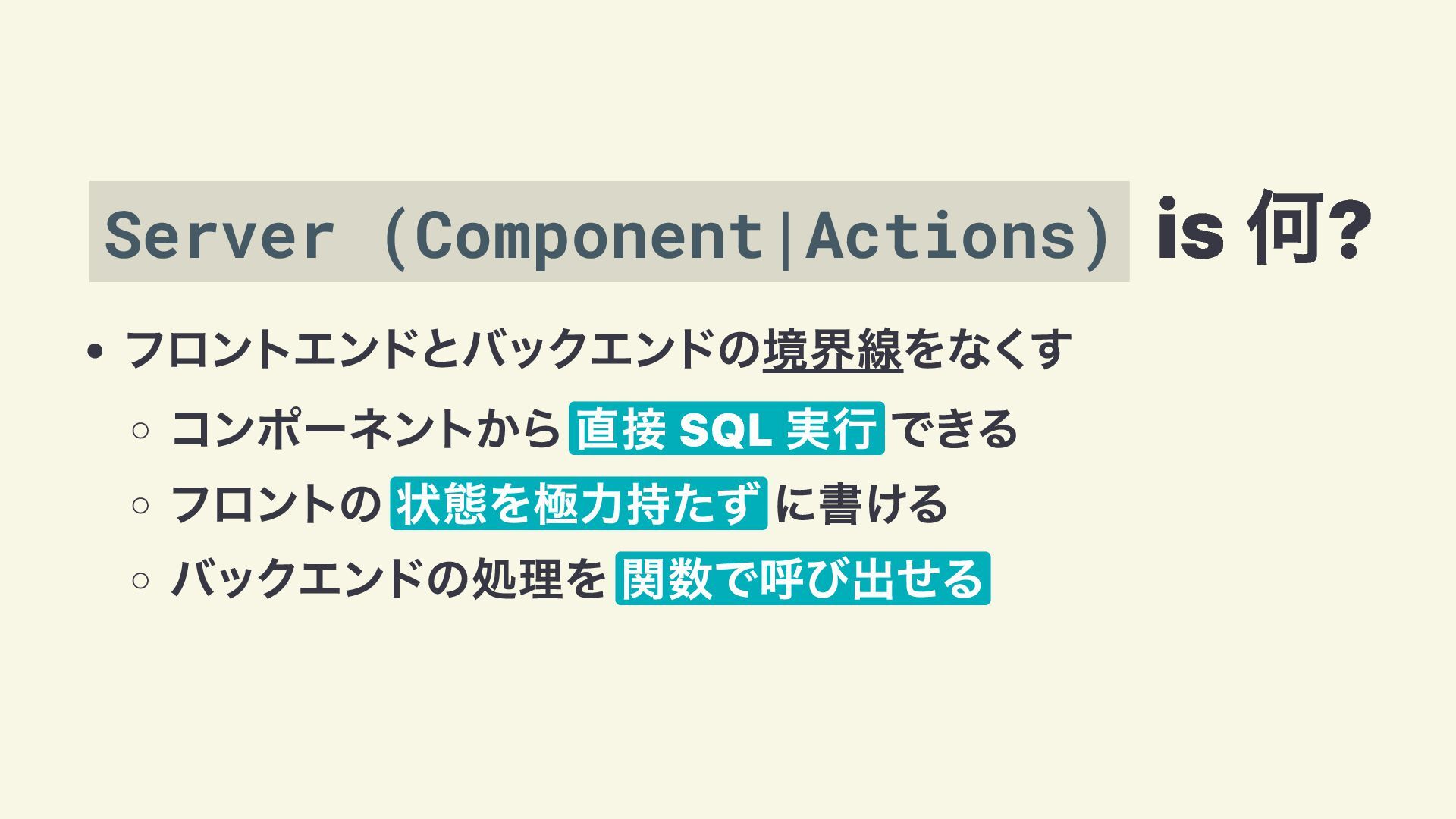 Server (Component|Actions) is 何? フロントエンドとバックエンドの境界線をなくす コンポーネントから直接 SQL 実行できる フロントの状態を極力持たずに書ける バックエンドの処理を関数で呼び出せる