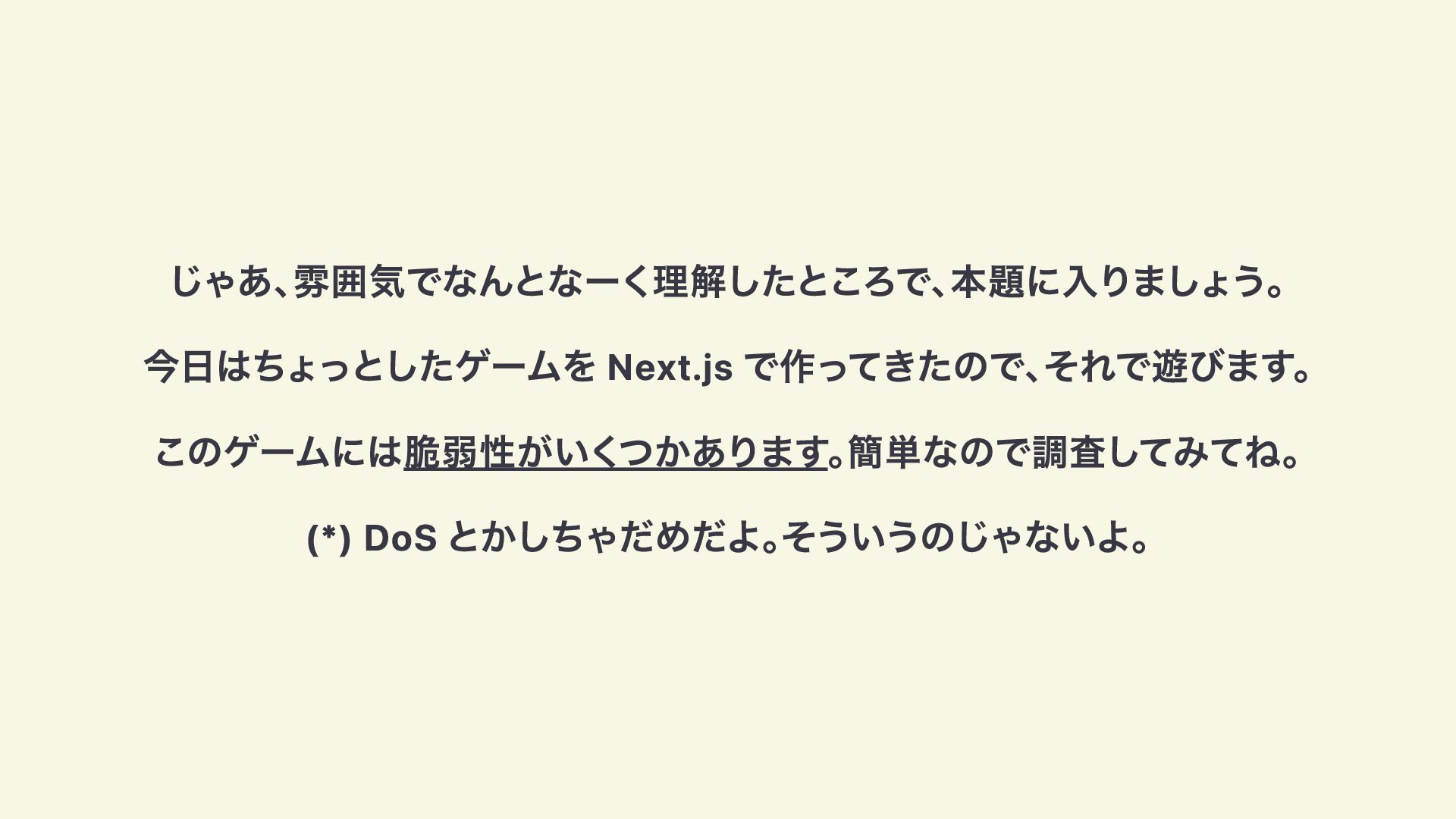 じゃあ、 雰囲気でなんとなーく理解したところで、 本題に入りましょう。 今日はちょっとしたゲームを Next.js で作ってきたので、 それで遊びます。 このゲームには脆弱性がいくつかあります。 簡単なので調査してみてね。 (*)