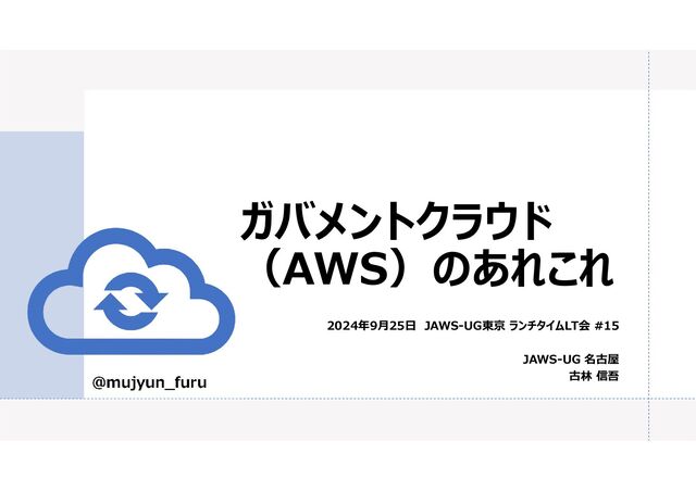 ガバメントクラウド (AWS)のあれこれ @mujyun_furu 2024年9月25日 JAWS-UG東京 ランチタイムLT会 #15 JAWS-UG 名古屋 古林