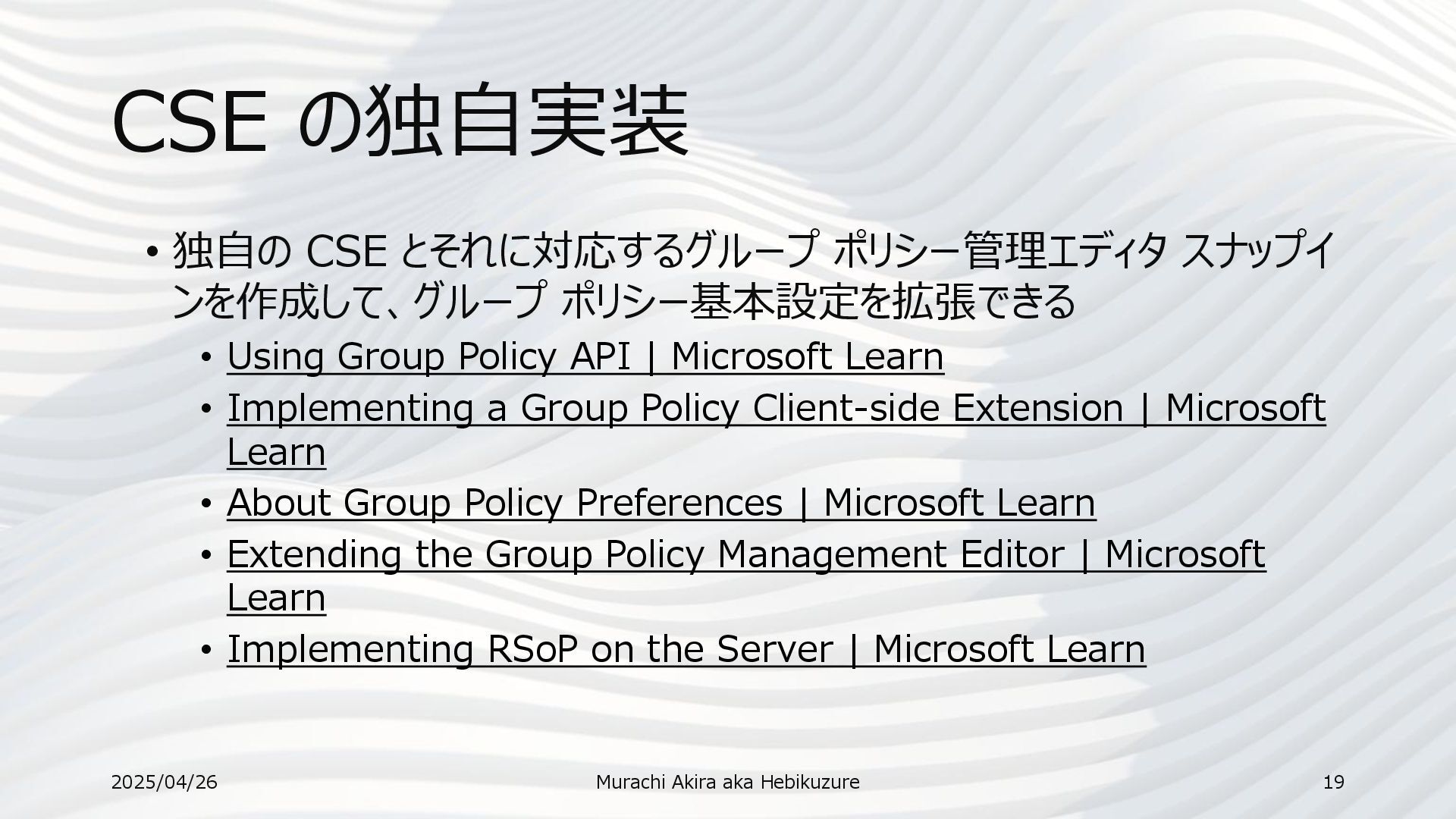 • Using Group Policy API | Microsoft Learn • Implementing a Group Policy Client-side Extension | Microsoft Learn • About Group Policy Preferences | Microsoft Learn • Extending the Group Policy Management Editor | Microsoft Learn • Implementing RSoP on the Server | Microsoft Learn 2025/04/26 Murachi Akira aka Hebikuzure 19