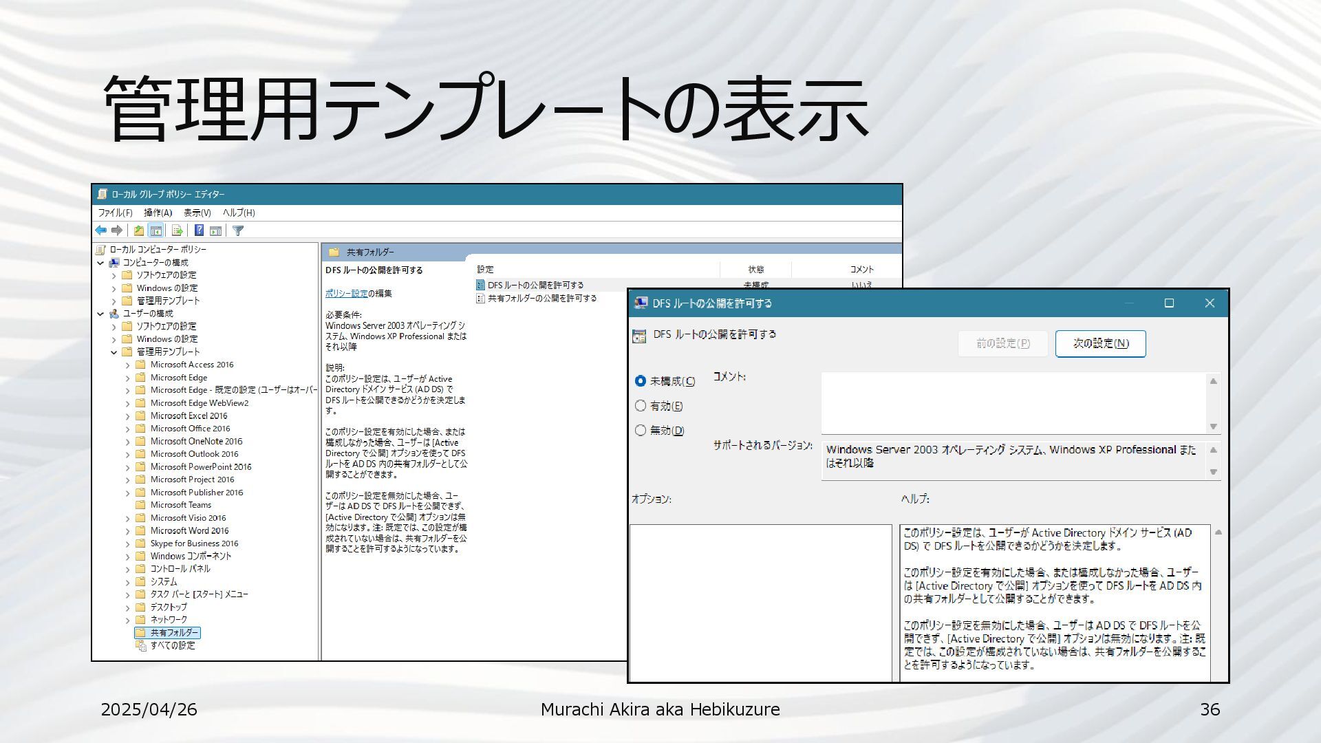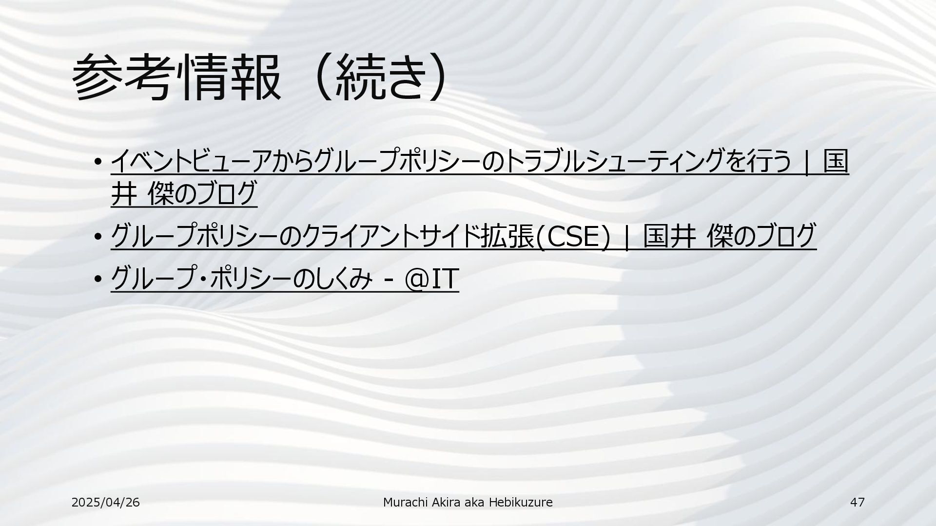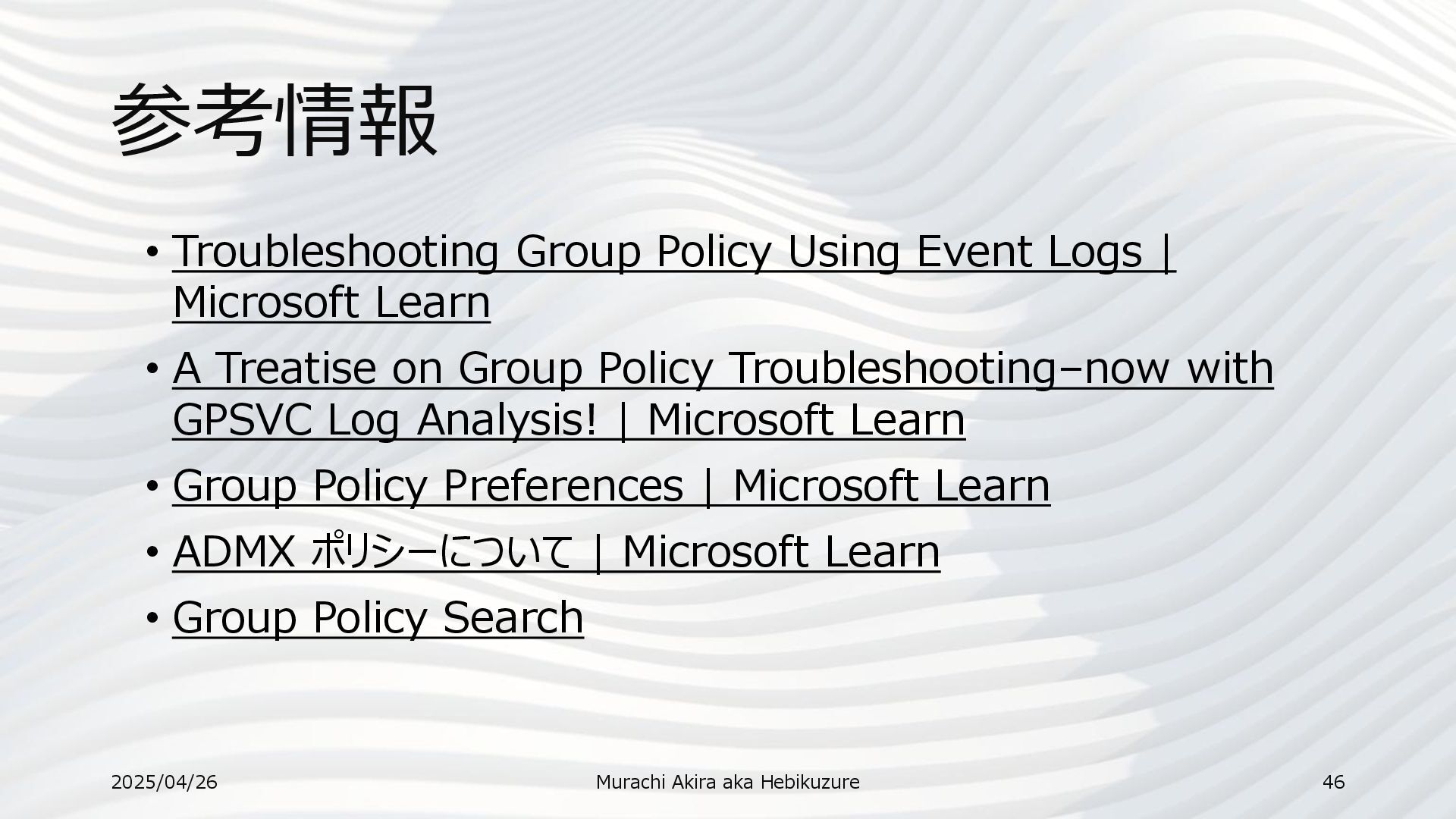 Learn • A Treatise on Group Policy Troubleshooting–now with GPSVC Log Analysis! | Microsoft Learn • Group Policy Preferences | Microsoft Learn • ADMX ポリシーについて | Microsoft Learn • Group Policy Search 2025/04/26 Murachi Akira aka Hebikuzure 46