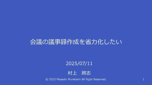 © 2025 Masashi Murakami All Right Reserved. 1 会議の議事録作成を省力化したい 2025/07/11