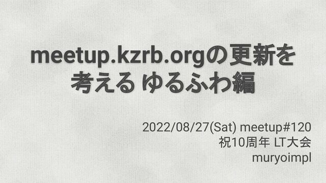 meetup.kzrb.orgの更新を 考える ゆるふわ編 2022/08/27(Sat) meetup#120 祝10周年 LT大会 muryoimpl