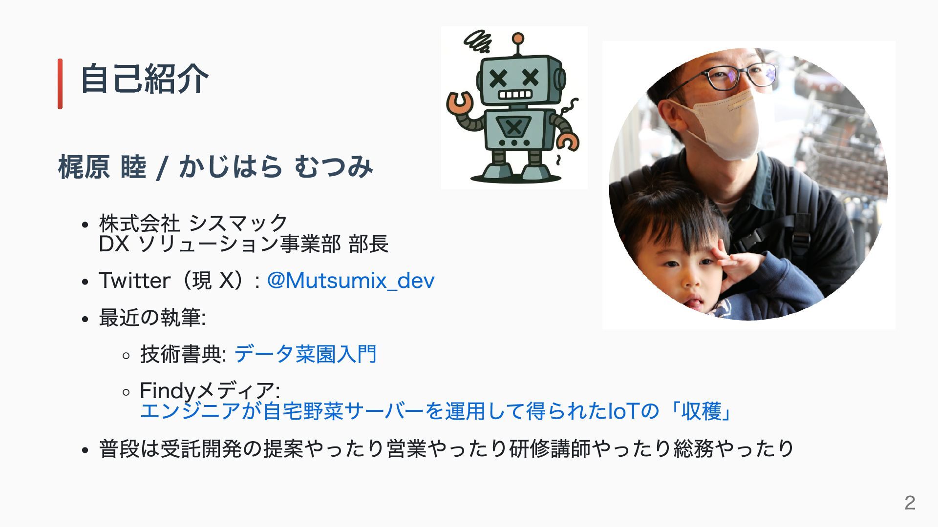 Twitter(現 X): @Mutsumix_dev 最近の執筆: 技術書典: データ菜園入門 Findyメディア: エンジニアが自宅野菜サーバーを運用して得られたIoTの「収穫」 普段は受託開発の提案やったり営業やったり研修講師やったり総務やったり 自己紹介 2
