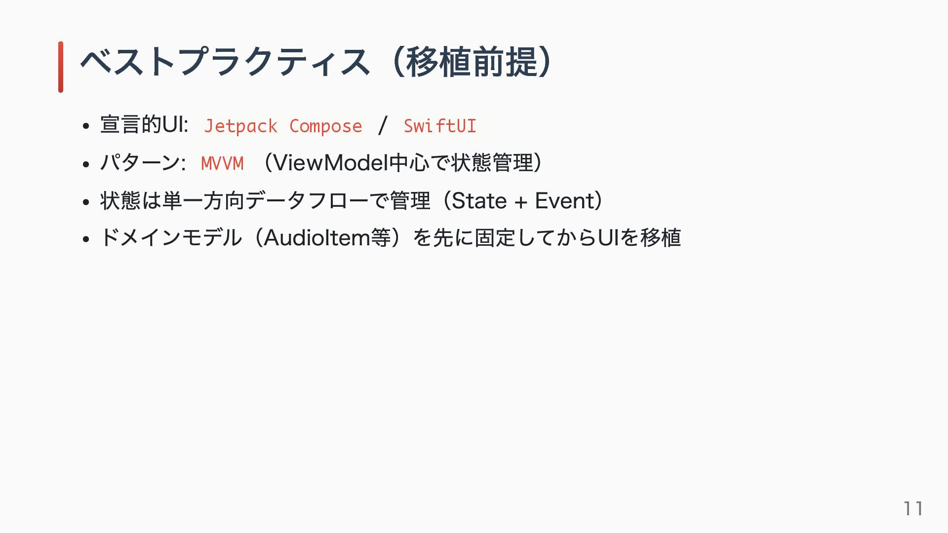 Event) ドメインモデル(AudioItem等)を先に固定してからUIを移植 ベストプラクティス(移植前提) 11