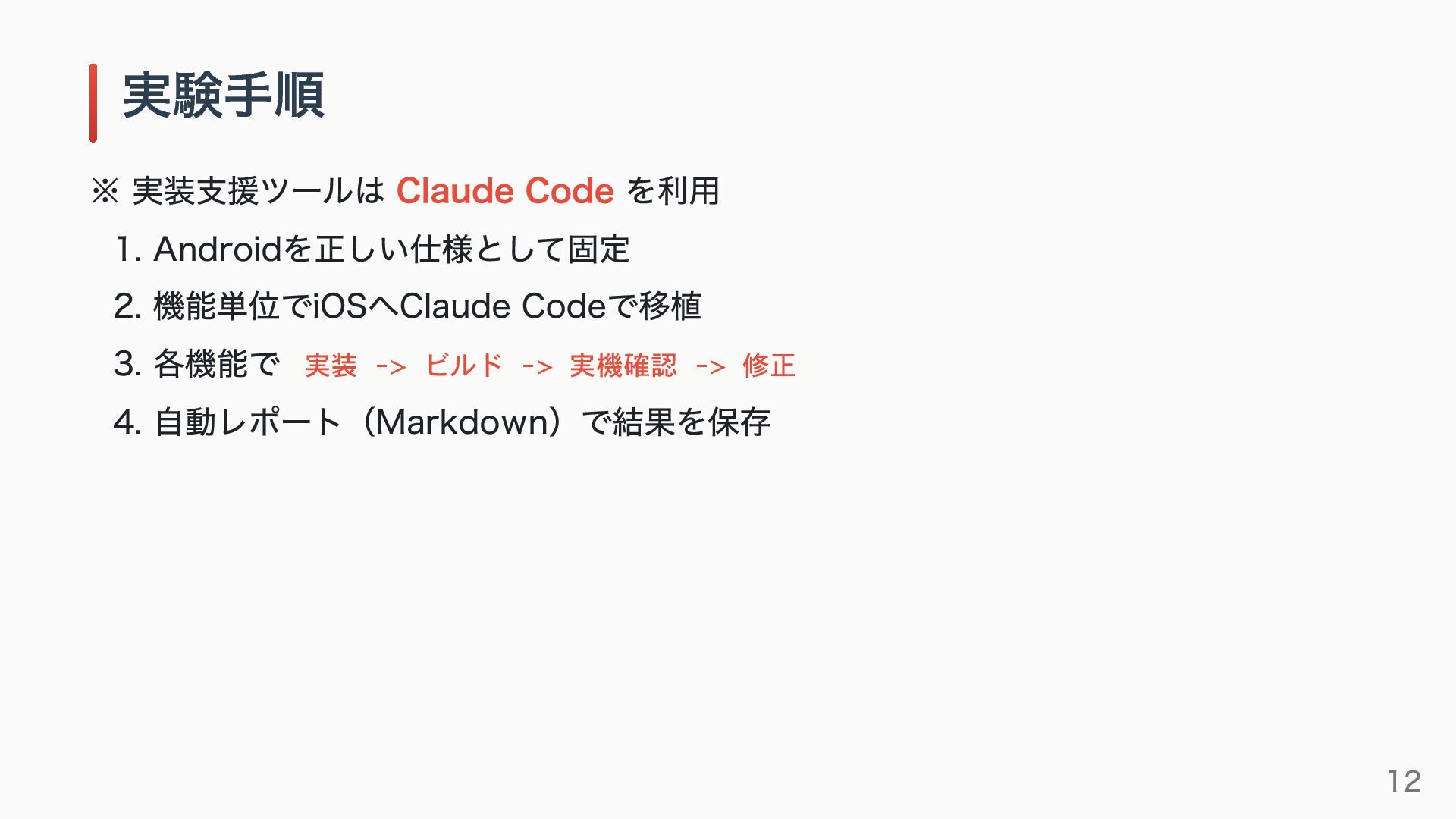 3. 各機能で 実装 -> ビルド -> 実機確認 -> 修正 4. 自動レポート(Markdown)で結果を保存 実験手順 12
