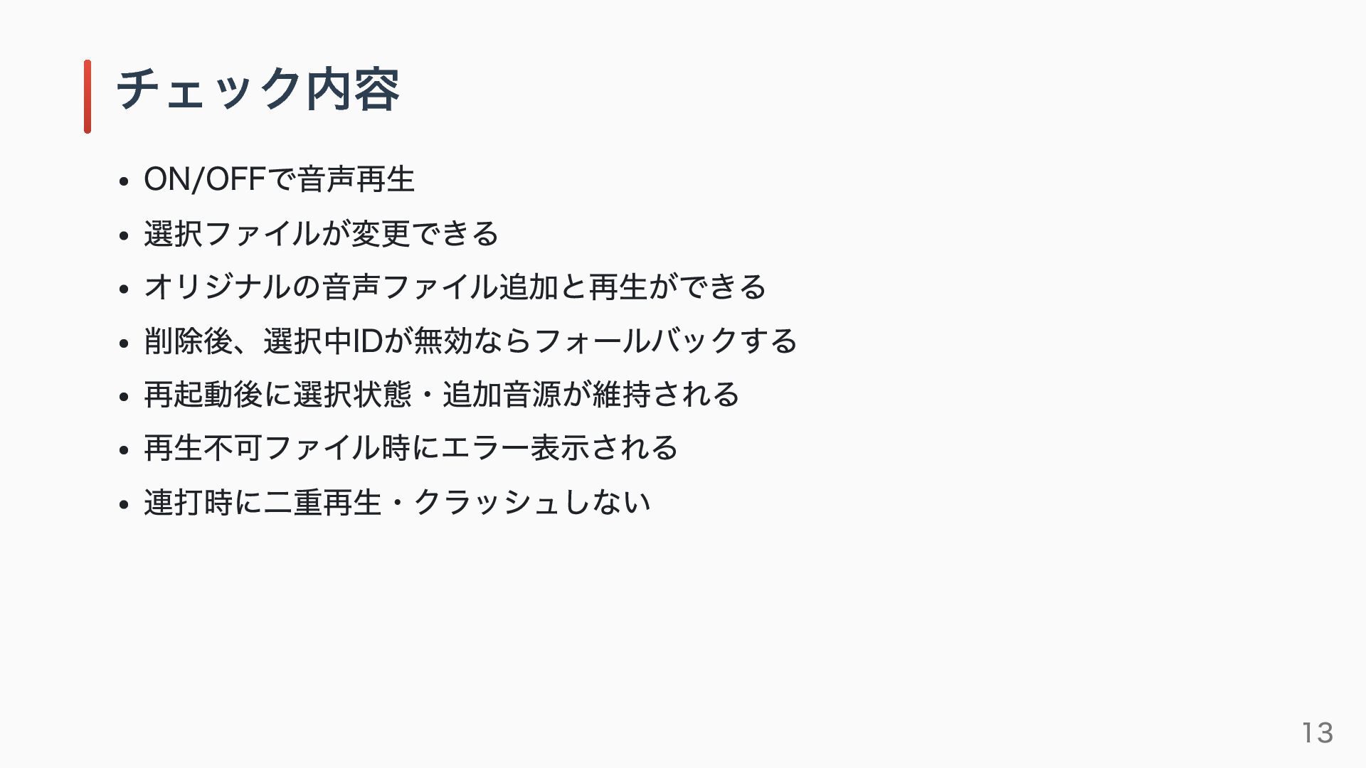 ON/OFFで音声再生 選択ファイルが変更できる オリジナルの音声ファイル追加と再生ができる 削除後、選択中IDが無効ならフォールバックする 再起動後に選択状態・追加音源が維持される 再生不可ファイル時にエラー表示される 連打時に二重再生・クラッシュしない チェック内容 13