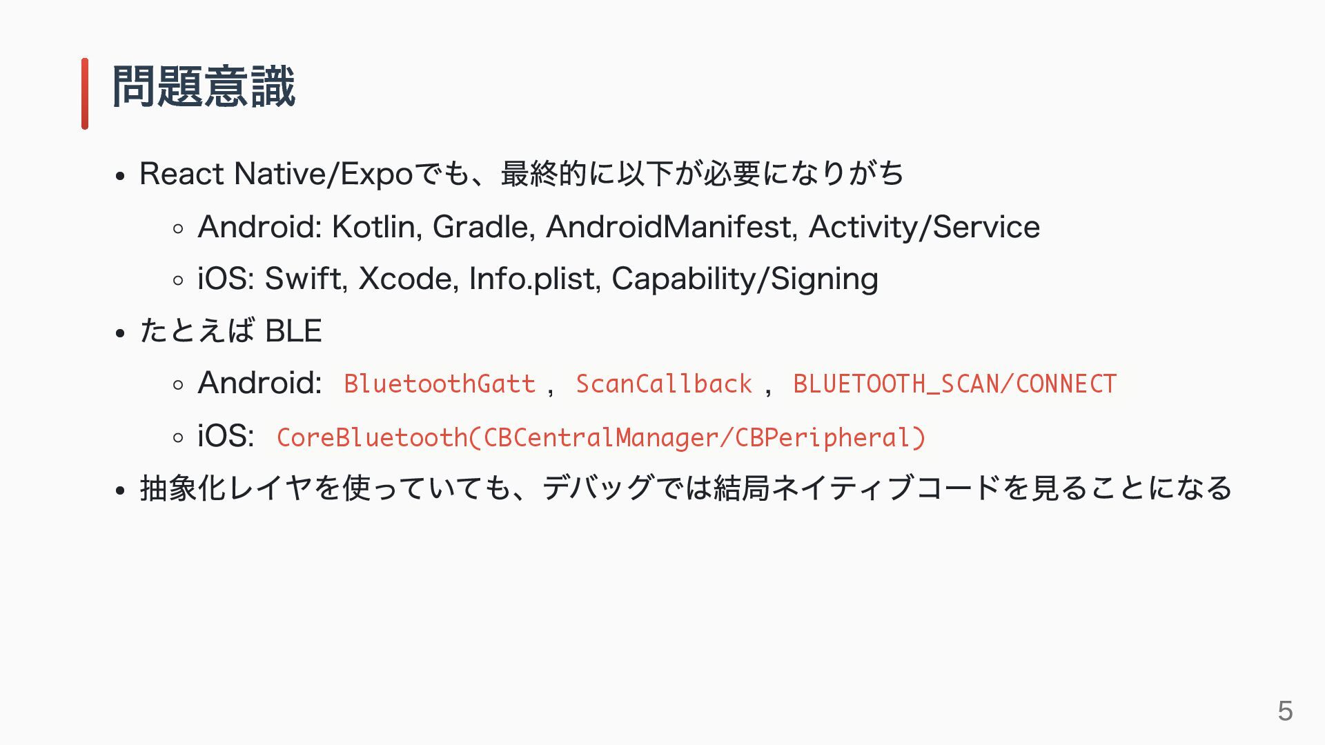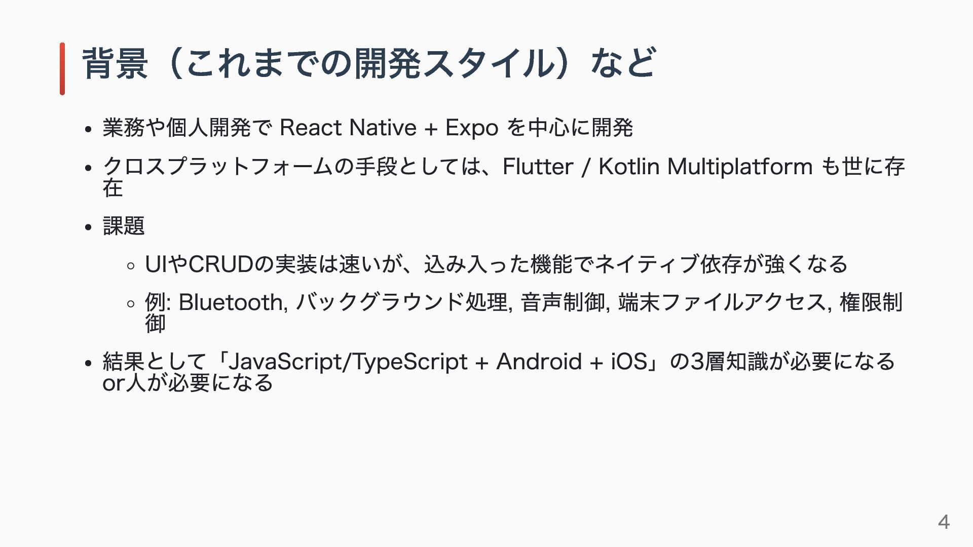 も世に存 在 課題 UIやCRUDの実装は速いが、込み入った機能でネイティブ依存が強くなる 例: Bluetooth, バックグラウンド処理, 音声制御, 端末ファイルアクセス, 権限制 御 結果として「JavaScript/TypeScript + Android + iOS」の3層知識が必要になる or人が必要になる 背景(これまでの開発スタイル)など 4