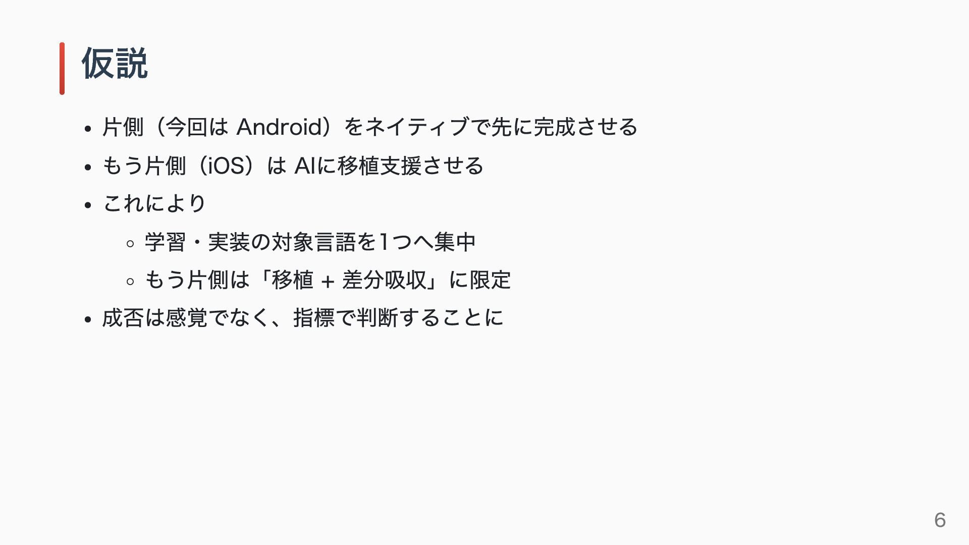 片側(今回は Android)をネイティブで先に完成させる もう片側(iOS)は AIに移植支援させる これにより 学習・実装の対象言語を1つへ集中 もう片側は「移植 + 差分吸収」に限定 成否は感覚でなく、指標で判断することに