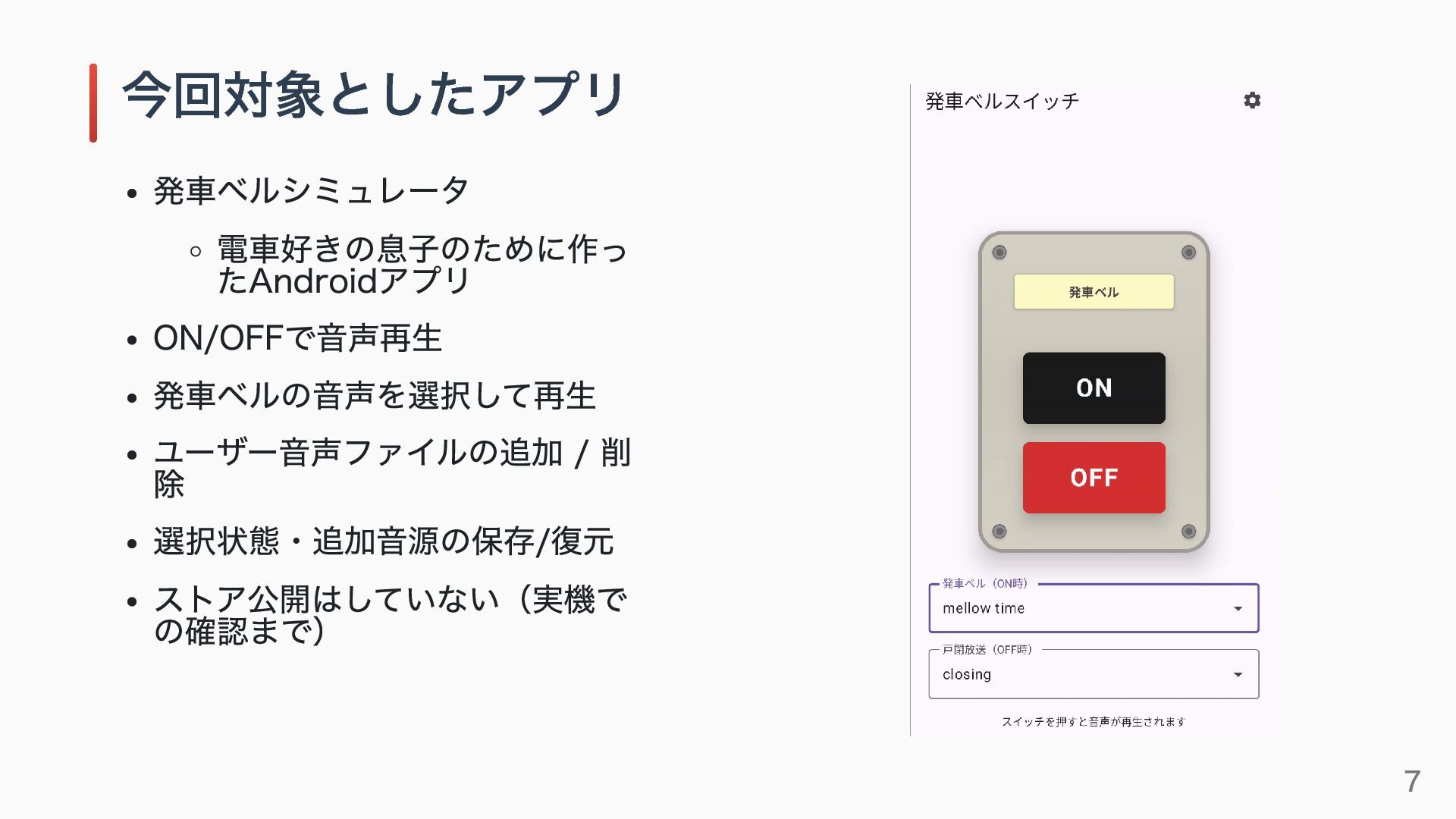 発車ベルシミュレータ 電車好きの息子のために作っ たAndroidアプリ ON/OFFで音声再生 発車ベルの音声を選択して再生 ユーザー音声ファイルの追加 / 削 除 選択状態・追加音源の保存/復元