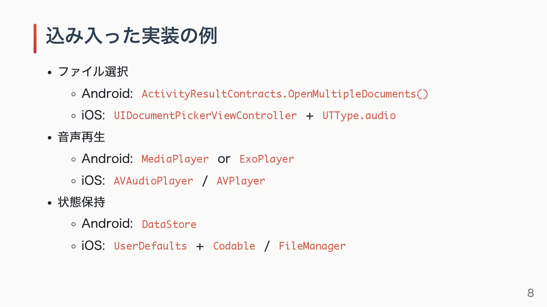 or ExoPlayer iOS: AVAudioPlayer / AVPlayer 状態保持 Android: DataStore iOS: UserDefaults + Codable / FileManager 込み入った実装の例 8