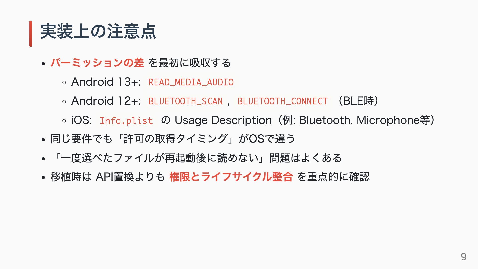 (BLE時) iOS: Info.plist の Usage Description(例: Bluetooth, Microphone等) 同じ要件でも「許可の取得タイミング」がOSで違う 「一度選べたファイルが再起動後に読めない」問題はよくある 移植時は API置換よりも 権限とライフサイクル整合 を重点的に確認 実装上の注意点 9