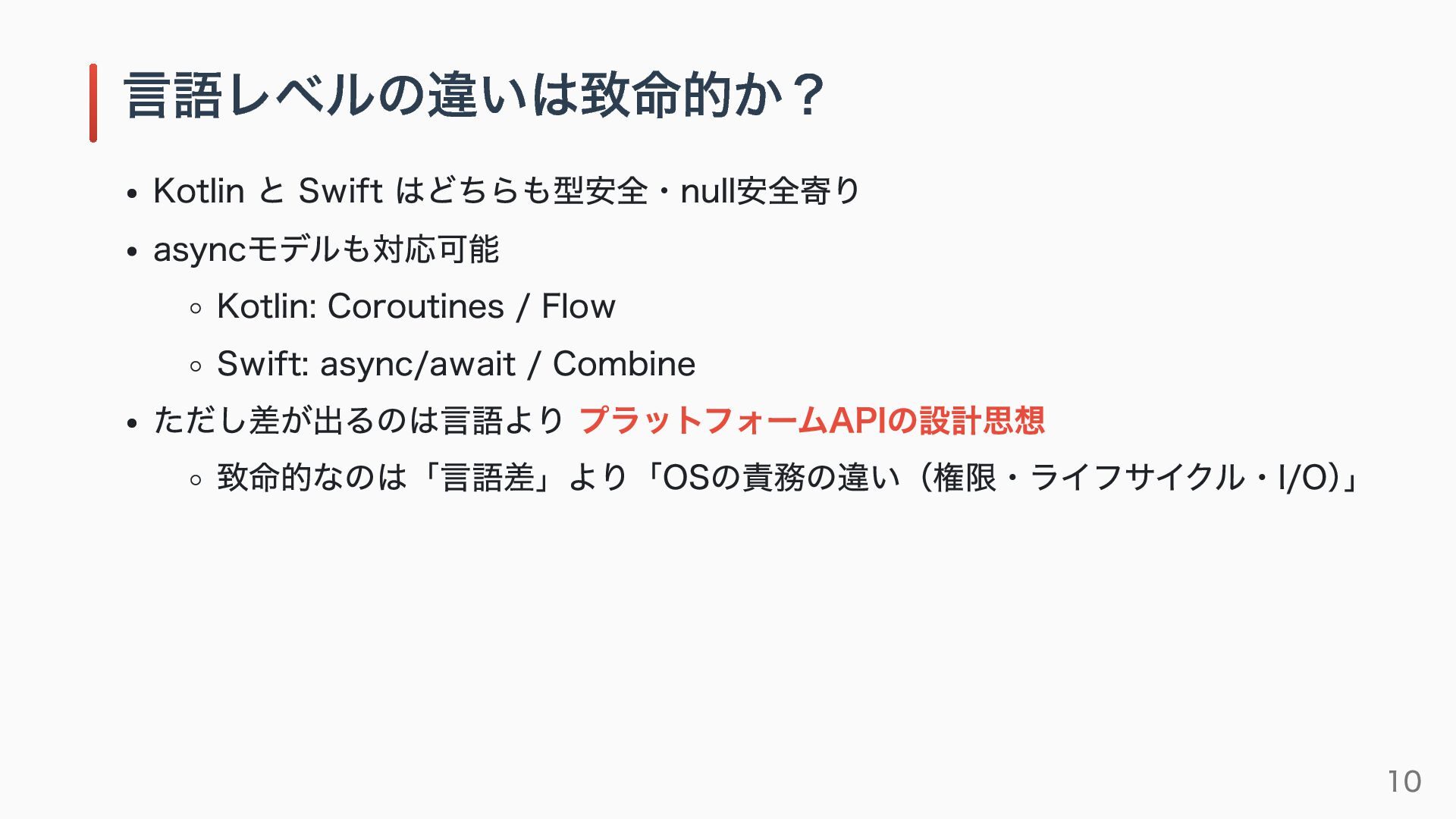 async/await / Combine ただし差が出るのは言語より プラットフォームAPIの設計思想 致命的なのは「言語差」より「OSの責務の違い(権限・ライフサイクル・I/O) 」 言語レベルの違いは致命的か? 10